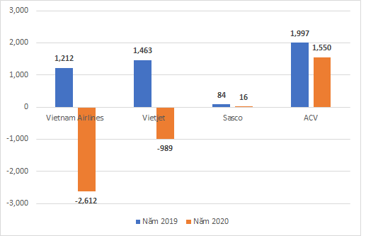 Trong đó, Tổng công ty Hàng không Việt Nam (Vietnam Airlines - Mã: HVN) là đơn vị chịu tổn thất nặng nề nhất khi doanh thu thuần giảm hơn 26% còn 18.800 tỷ đồng. Vietnam Airlines lỗ nặng 2.611 tỷ đồng bất chấp những nỗ lực cắt giảm chi phí, giảm nhân sự, cắt giảm lương… Số lỗ này vượt qua cả mức lãi 2.537 tỷ đồng hãng hàng không quốc gia đạt được trong cả năm 2019.