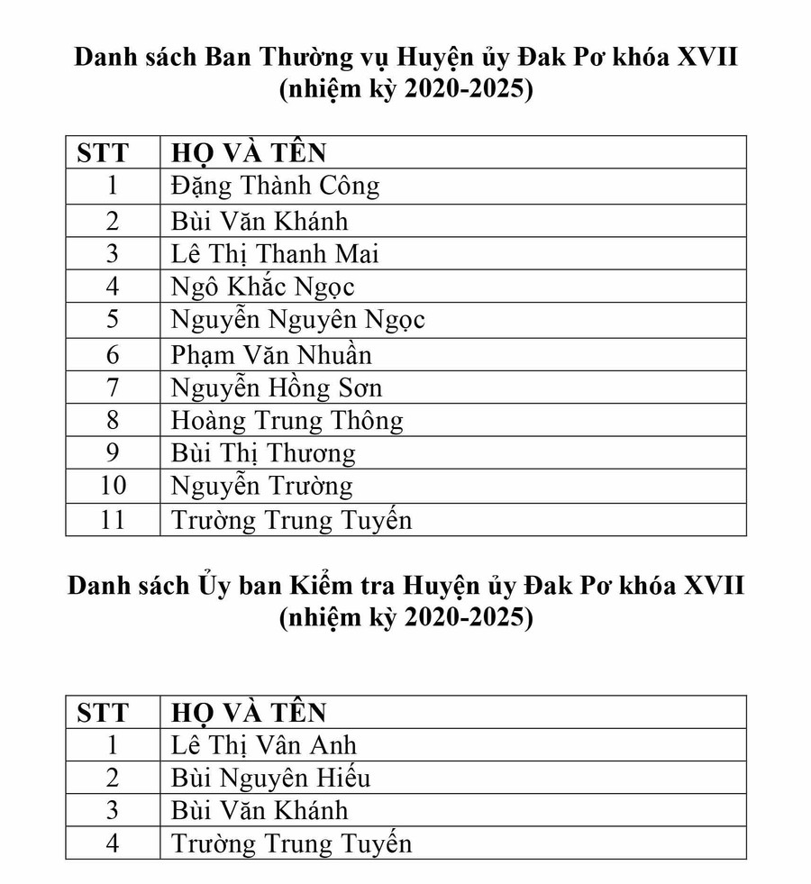 Theo kết quả Hội nghị lần thứ nhất Ban Chấp hành Đảng bộ huyện Đak Pơ khóa XVII, ông Ngô Khắc Ngọc-Bí thư Huyện ủy khóa XVI được tín nhiệm bầu giữ chức Bí thư Huyện ủy khóa XVII. Bà Lê Thị Thanh Mai-Phó Bí thư Thường trực Huyện ủy khóa XVI và ông Nguyễn Trường-Phó Bí thư Huyện ủy, Chủ tịch UBND huyện khóa XVI tiếp tục giữ chức Phó Bí thư Huyện ủy khóa XVII.
