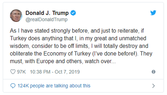 "Như tôi đã tuyên bố cứng rắn trước đó và giờ tôi chỉ nhấn mạnh lại rằng, nếu Thổ Nhĩ Kỳ làm điều gì đó mà tôi, với trí thông minh tuyệt vời không ai sánh được, coi là vượt giới hạn, tôi sẽ phá hủy và xóa sổ hoàn toàn kinh tế Thổ Nhĩ Kỳ (tôi từng làm trước đó). Họ phải cùng với châu Âu và các nước khác kiểm soát (chống khủng bố ở Syria)", Tổng thống Trump bình luận trên Twitter ngày 7/10.