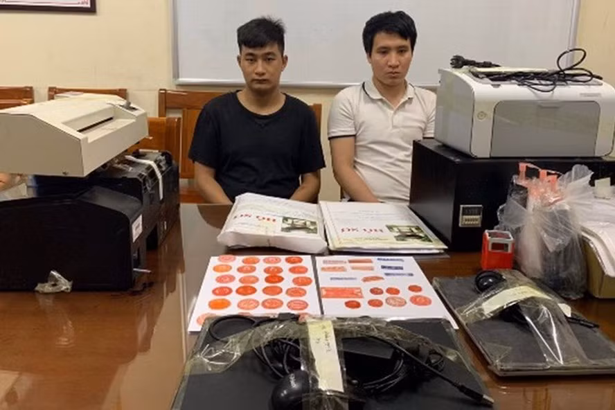 Tại căn phòng trọ của Hoàng, lực lượng chức năng thu giữ nhiều máy móc, thiết bị, con dấu, hồ sơ giả.