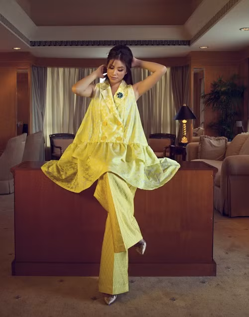 Sắc vàng của hoa, của nắng gió mùa hạ được tái hiện khá sinh động với sự thay đổi hoạ tiết đa dạng. Từ những cánh hoa mong manh cho đến hình lục giác, hoạ tiết chấm bi to bản, hoạ tiết im chìm, dập nổi tạo nên nhiều sự lựa chọn cho quý cô trong ngày hè rực nắng.
