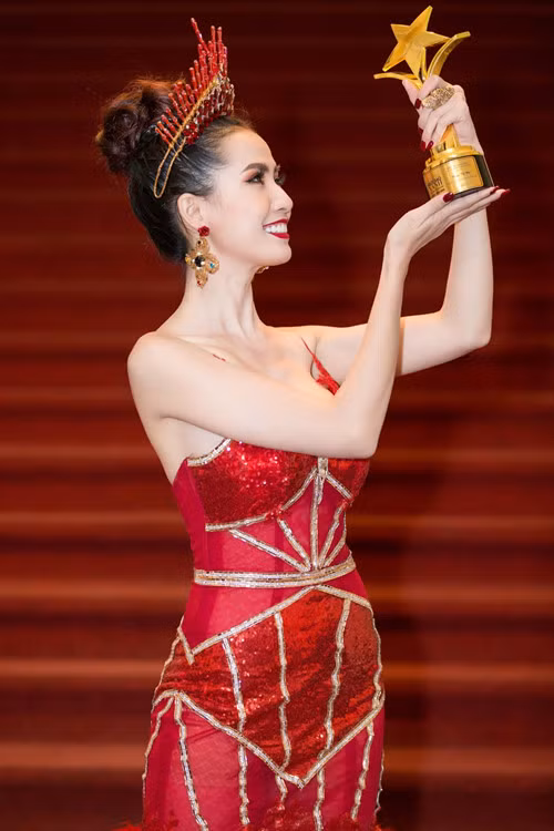 | Phan Thị Mơ đội vương miện, diện trang phục đỏ gợi cảm sánh đôi cùng ca sĩ Nguyên Vũ. |