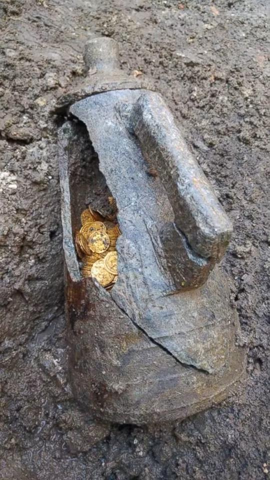 Bộ này sau đó chia sẻ những bức ảnh chụp các đồng tiền vàng sáng bóng đựng trong một chiếc lọ có từ thời La Mã với 2 tay cầm chôn dưới lòng đất.