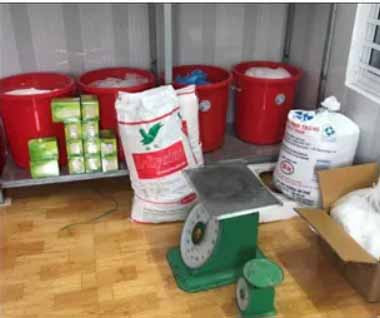 Tại đây, lực lượng làm nhiệm vụ phát hiện gần 6.000 hũ nước yến sào các loại và nguyên liệu sản xuất nước yến gồm: 25 kg L-Lysine, 46 kg đường kính trắng, 23 kg Tauline (JP17), 80 gram nguyên liệu hương yến, 11 hộp mủ trôm cánh trắng Natunal+ (500 gr/hộp), 4 bì mủ trôm cánh trắng CPR (1kg/bì), 4 thùng nhựa chứa các chất phụ gia không nhãn các loại có tổng trọng lượng 86 kg (tính cả bao bì) không có giấy tờ chứng minh nguồn gốc hợp pháp, có dấu hiệu không đúng theo các chỉ tiêu đã công bố trên các sản phẩm…