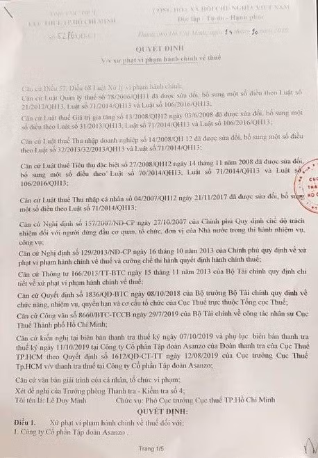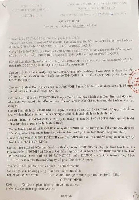 Cục thuế TP.HCM ban hành quyết định xử phạt về thuế, truy thu với Công ty cổ phần Tập đoàn Asanzo ngày 23-10 - Ảnh: NGỌC HIỂN