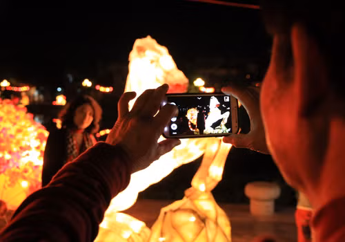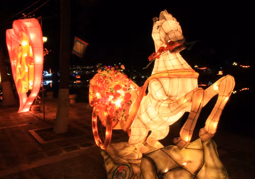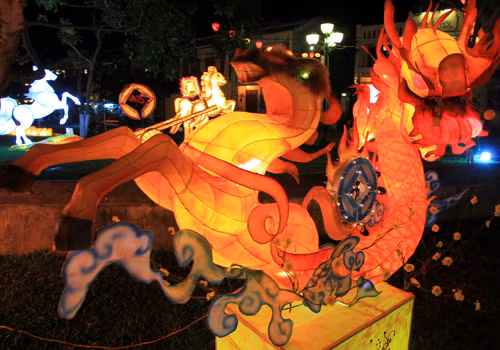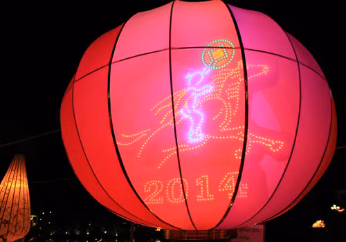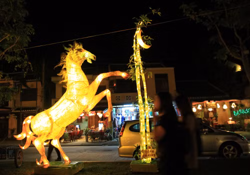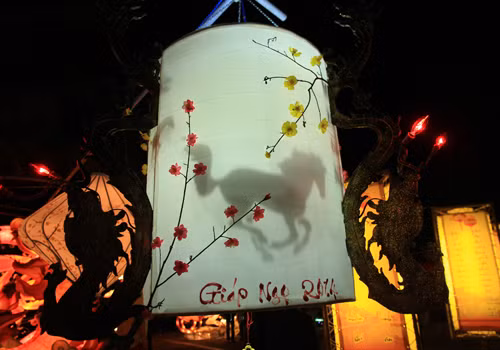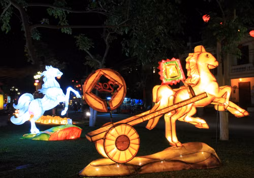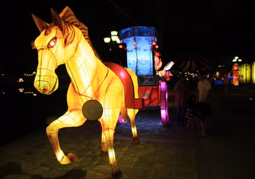 Tối 29 tháng Chạp, phố cổ Hội An lung linh sắc màu đèn lồng mừng năm mới Giáp Ngọ. Tại vườn tượng An Hội ven sông Hoài, du khách thỏa thích ngắm nhìn những chiếc đèn lồng lớn hình ngựa. Tác phẩm Giáp Ngọ nghinh xuân của trường tiểu học Đỗ Mạnh Hường với hình ngựa phi, chân và thân ghép thành dòng chữ 2014.