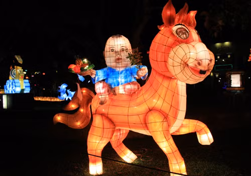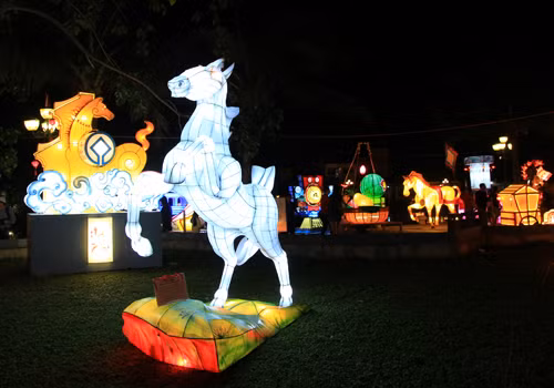 Ngựa vàng chở theo tiền vàng, hay ngựa bạch uy phong được bày trí dọc vườn tượng. Đây là những tác phẩm dự thi đèn lồng diễn ra đến mùng 5 Tết.