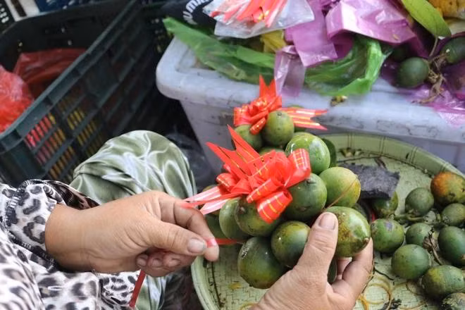 Trên mỗi cuống buồng cau, ông Cảnh cẩn thận đính một chiếc nơ đỏ lớn, từng quả đều được tỉ mỉ dán chữ hỷ. Mỗi buồng được sắp thêm những lá trầu xanh và 6 cánh phượng, tạo nên vẻ đẹp hài hoà, đậm chất truyền thống.