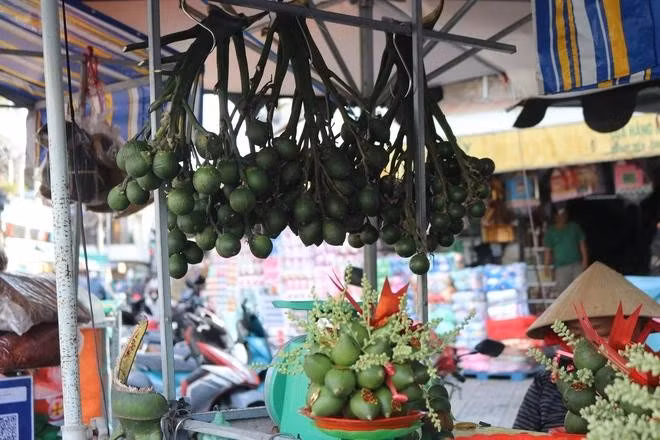 Cách quầy của bà Phước không xa, là gian hàng của vợ chồng ông Cảnh (56 tuổi, quê ở Hậu Giang). Gian hàng của ông nổi bật với những buồng cau xanh mướt, tròn bóng cùng những lá trầu tươi được xếp thành hàng rất đẹp mắt.