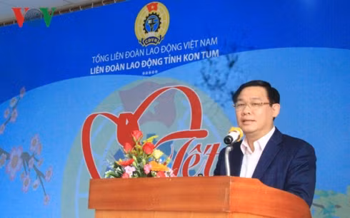 Đối với việc chăm lo cuộc sống cho đoàn viên công đoàn và người lao động của tỉnh Kon Tum, Phó Thủ tướng Vương Đình Huệ nhấn mạnh: “Tôi đề nghị cấp ủy Đảng và chính quyền từ cấp tỉnh cho đến cấp huyện, các doanh nghiệp, các tổ chức công đoàn tiếp tục lãnh đạo, chỉ đạop để nâng cao chất lượng hoạt động của công đoàn cơ sở đồng thời có giải pháp tháo gỡ khó khăn cho doanh nghiệp tạo tiền đề để công đoàn làm tốt nhiệm vụ phát triển đoàn viên, chủ động tập hợp công nhân lao động trong tình hình mới. Thực hiện có hiệu quả chương trình phúc lợi. Thường xuyên tổ chức các hoạt động chăm lo bảo vệ quyền, lợi ích hợp pháp, chính đáng cho người lao động. Thực hiện tốt an sinh xã hội. Kết hợp chặt chẽ với tổ chức công đoàn và doanh nghiệp để tổ chức và chăm lo Tết cho công nhân lao động với tinh thần tất cả người lao động ai cũng có Tết”.