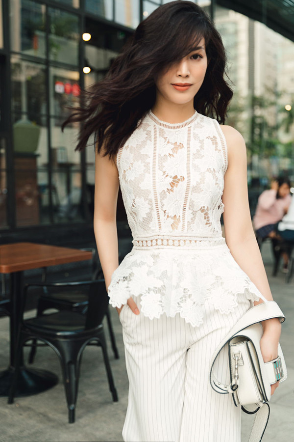 Áo ren trắng dáng peplum, quần kẻ sọc ống lửng và phụ kiện tông trắng sẽ giúp các bạn gái có được hình ảnh nhẹ nhàng và thanh lịch khi đến văn phòng.