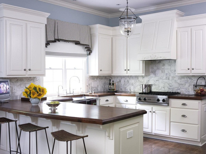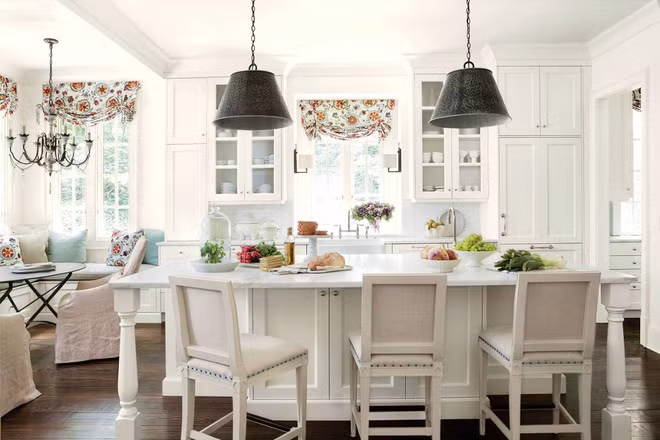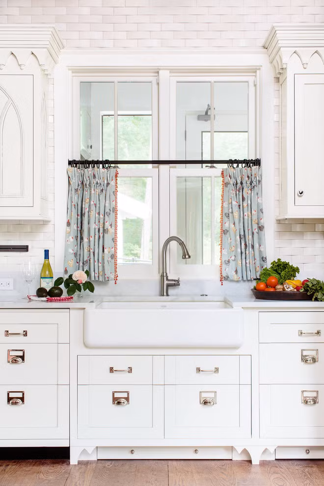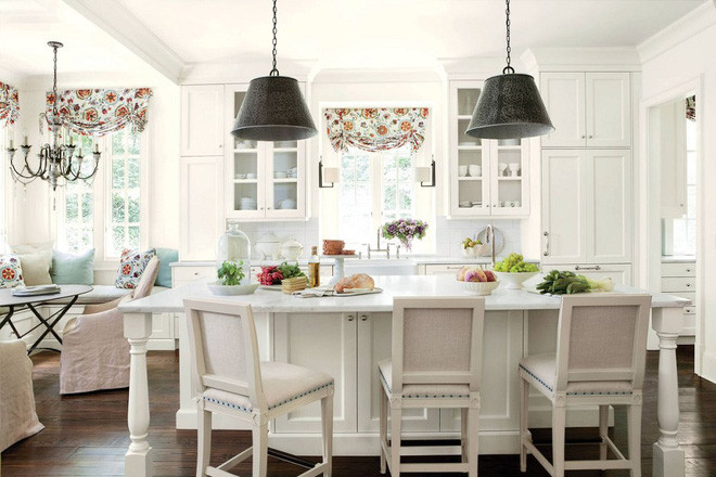 Rèm hoa giúp không gian nhà bạn có cái nhìn bắt mắt hơn. Trong khi phần lớn không gian phòng bếp là đồ nội thất và gạch sáng màu thì một chút hoa văn sẽ giúp không gian trở nên đỡ nhạt nhòa.