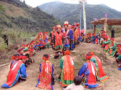 Người Dao đỏ không tự làm lễ mà mời thầy cúng hoặc những người lớn tuổi có uy tín trong cộng đồng. Trước sự có mặt đông đủ của mọi thành viên trong gia đình, thầy cúng thay mặt gia chủ làm lễ cúng giải hạn, để xua đi tất cả những điều rủi ro, không may mắn trong năm cũ. Và mời “ma nhà”, gồm có ông bà, tổ tiên và những người đã khuất, về ăn Tết, cầu xin sức khỏe, may mắn và sự bình an cho tất cả mọi người, xin cho mưa thuận gió hòa, mùa màng tươi tốt, trâu bò lợn gà khỏe mạnh.
