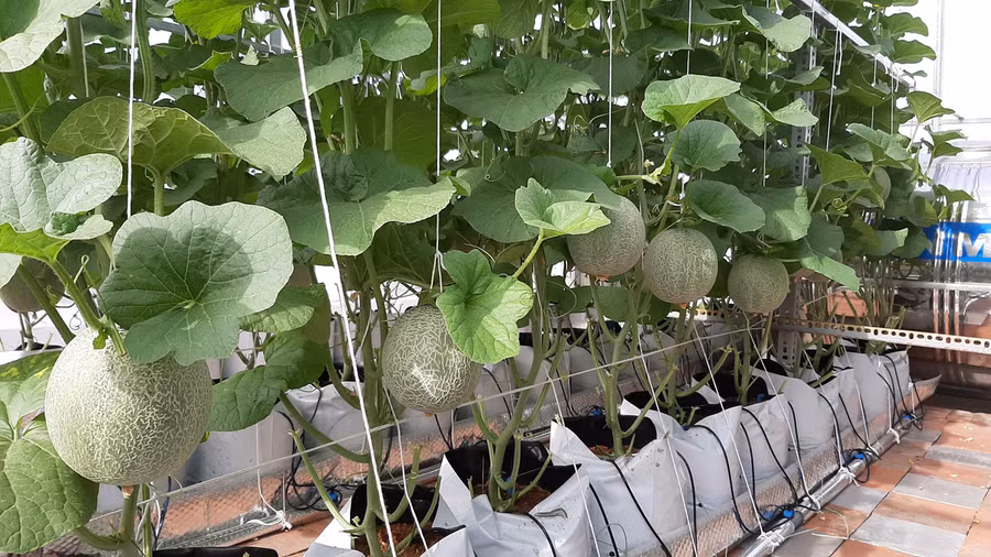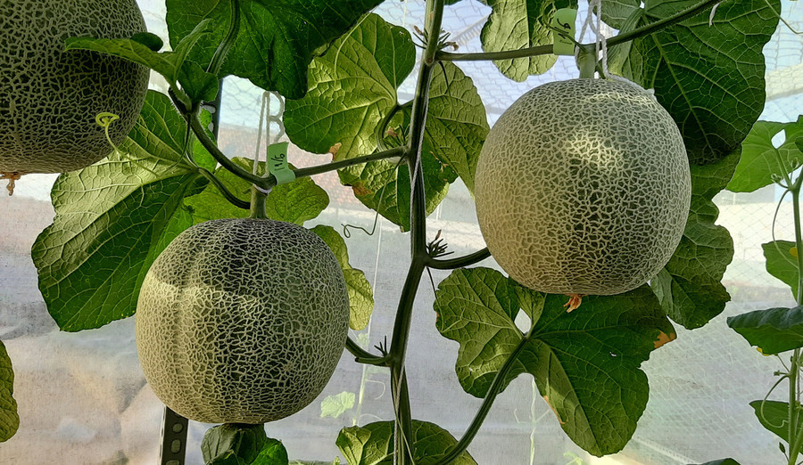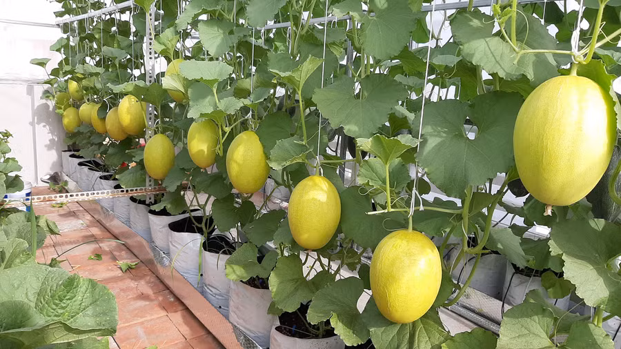 Sau hơn 3 tháng, đến nay vườn dưa sắp "về đích". Những trái dưa lưới Nhật - đều là các giống mới lạ chưa phổ biến ở Việt Nam - quả to đều. Ước tính vườn sẽ cho thu hoạch 100 quả, tương đương 200 kg dưa.