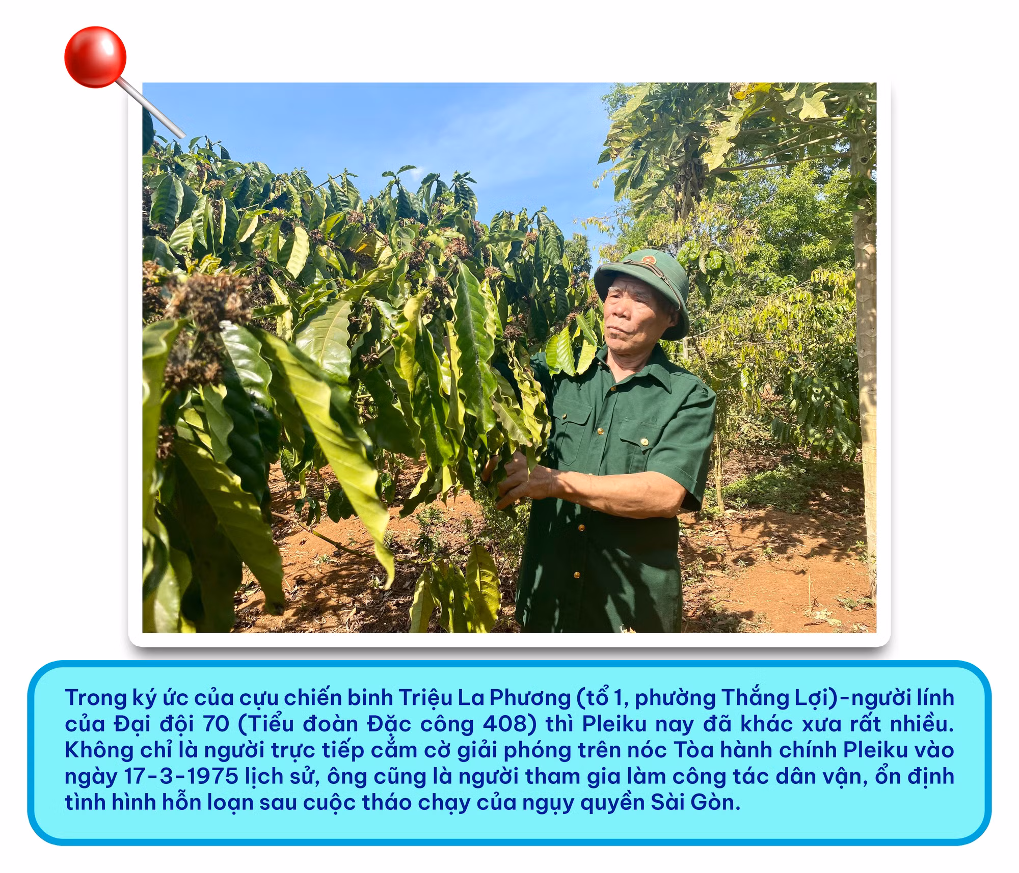 Riêng gia đình tôi, sau 1 đêm ở lại phi trường Phú Bổn thì quay trở lại Pleiku theo tiếng gọi của bộ đội, chính quyền cách mạng. Khi quay trở lại cửa ngõ Pleiku (gần Khách sạn Hoàng Anh Gia Lai hiện nay), khung cảnh thị xã lúc đó vẫn rất hỗn loạn, vẫn còn tiếng súng nổ, khói lửa bốc cháy… Dù vậy, được sự hướng dẫn của bộ đội, chúng tôi quay trở về nhà mình an toàn và sẵn sàng cùng với chính quyền thị xã bước vào công cuộc tái thiết, xây dựng quê hương”.