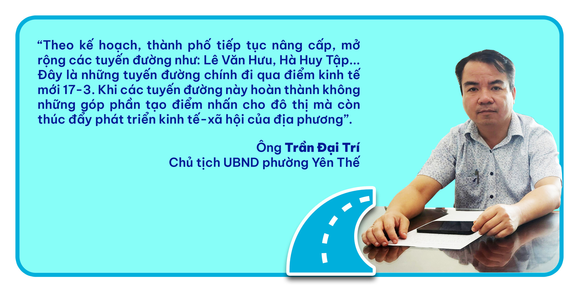 Điểm kinh tế 17-3 từ chỗ thưa thớt dân cư, nghèo khó, nay đã phát triển vượt bậc. Bộ mặt đô thị đi lên từng ngày, người dân ổn định làm ăn, kinh tế phát triển, số hộ giàu, hộ khá chiếm hơn 80%, đặc biệt không còn hộ nghèo. Ông Trần Đại Trí-Chủ tịch UBND phường Yên Thế-cho hay: Những năm qua, phường chú trọng vận động người dân hiến đất mở đường, đóng góp kinh phí cùng với Nhà nước làm đường hẻm, lắp điện chiếu sáng công cộng, xây dựng hội trường ở các tổ dân phố. Đặc biệt, năm 2019, thành phố đầu tư 16 tỷ đồng nâng cấp, mở rộng đường Phạm Ngọc Thạch. Đến nay, 100% đường hẻm tại khu dân cư được nhựa hóa, bê tông hóa. Nhờ đó, bộ mặt đô thị ngày càng khang trang, sạch đẹp hơn.