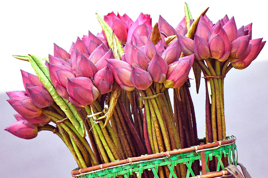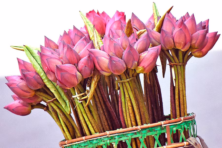 | Những chiếc gùi “chở” hoa sen đã làm nên nét duyên dáng của phố phường. |