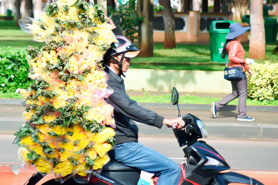| “Gánh hàng hoa” nay đã nhẹ nhàng hơn nhờ có xe máy, xe bánh đẩy. |