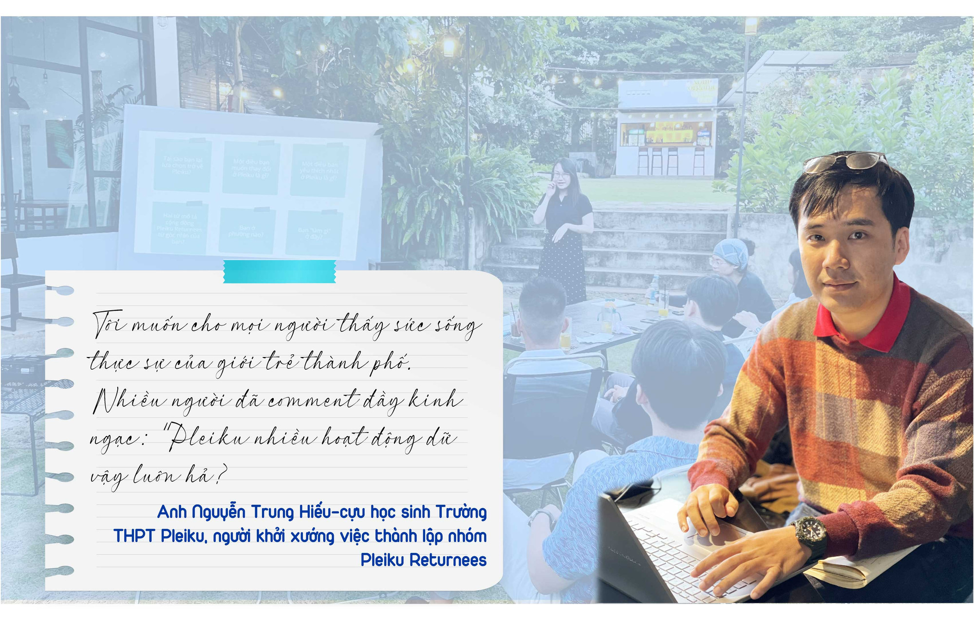 “Tại sao không tập hợp lại cùng nhau để thành một cộng đồng lớn hơn, hoạt động hiệu quả hơn?”. Từ câu hỏi đó, ngày 15-6-2023, anh khởi xướng việc lập nhóm và nhận được sự hưởng ứng nhiệt tình. Đến nay, có 18 câu lạc bộ và nhiều cá nhân, doanh nghiệp cùng tham gia vào cộng đồng Pleiku Returnees như: Pleiku English Club, Pleiku Book Club, Pleiku Mentors in Tech, Pleiku Art Curators, Roong Book… Các nhóm này đóng góp tâm huyết thông qua tổ chức nhiều hoạt động thú vị ở các lĩnh vực gồm kinh doanh, giải trí, văn hóa, thời trang, giáo dục.