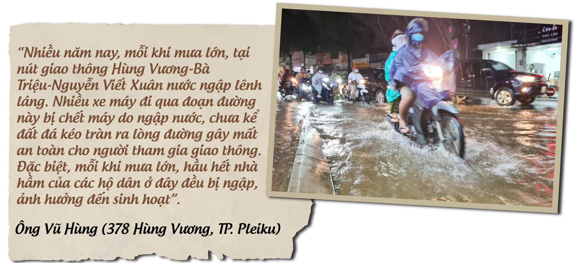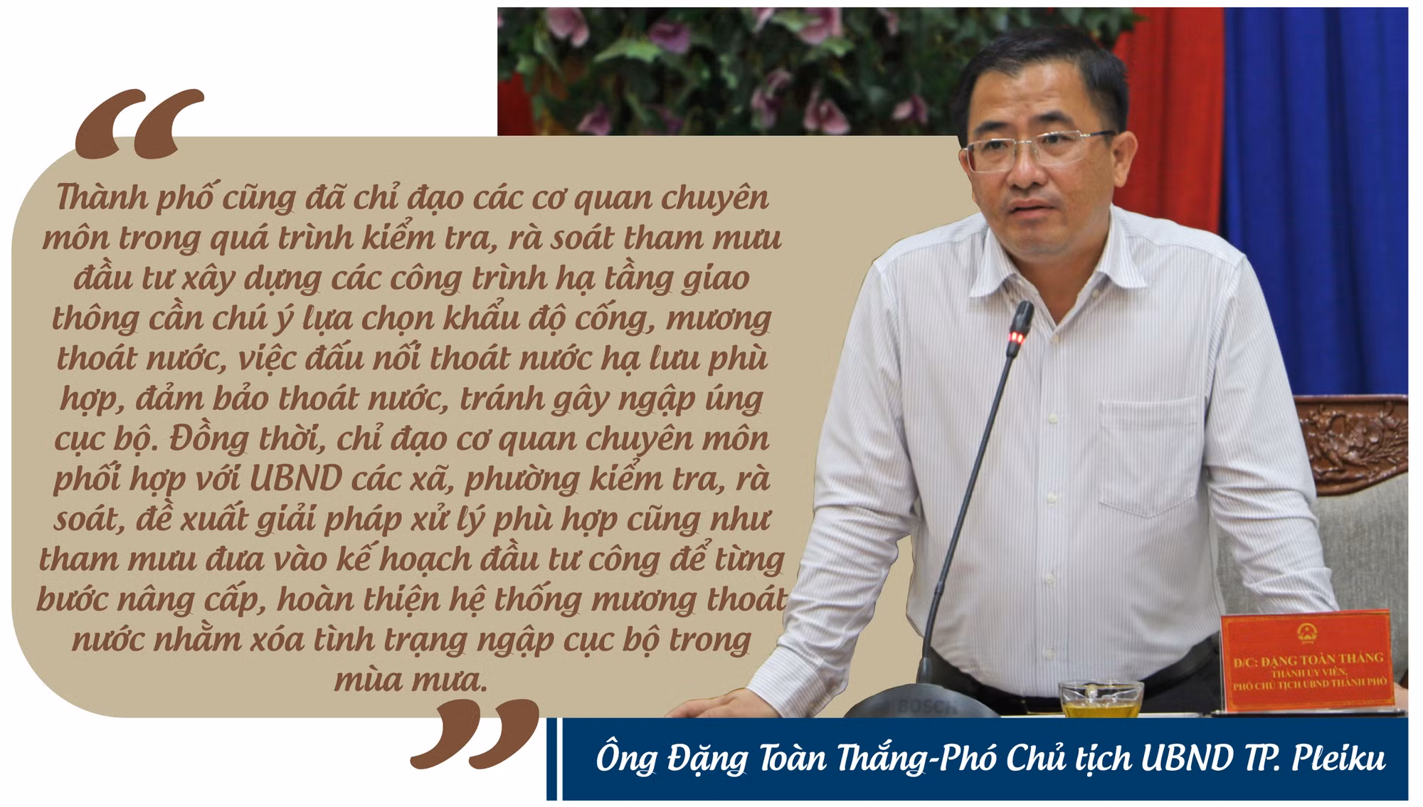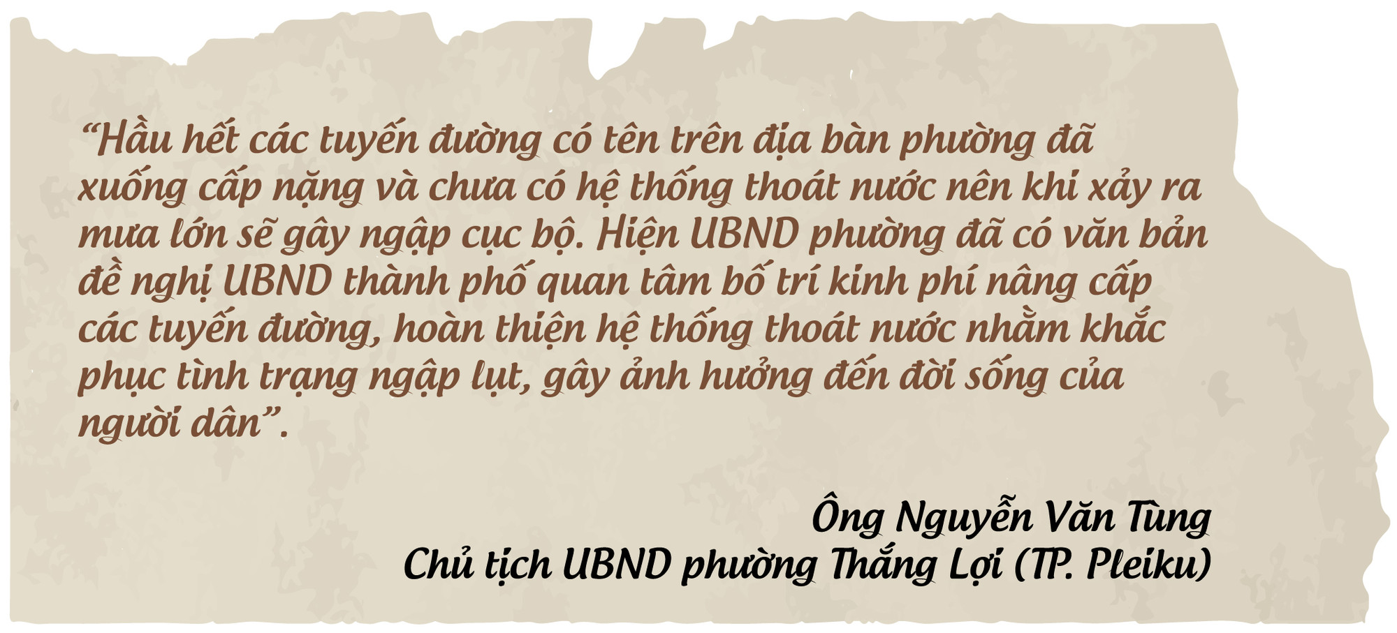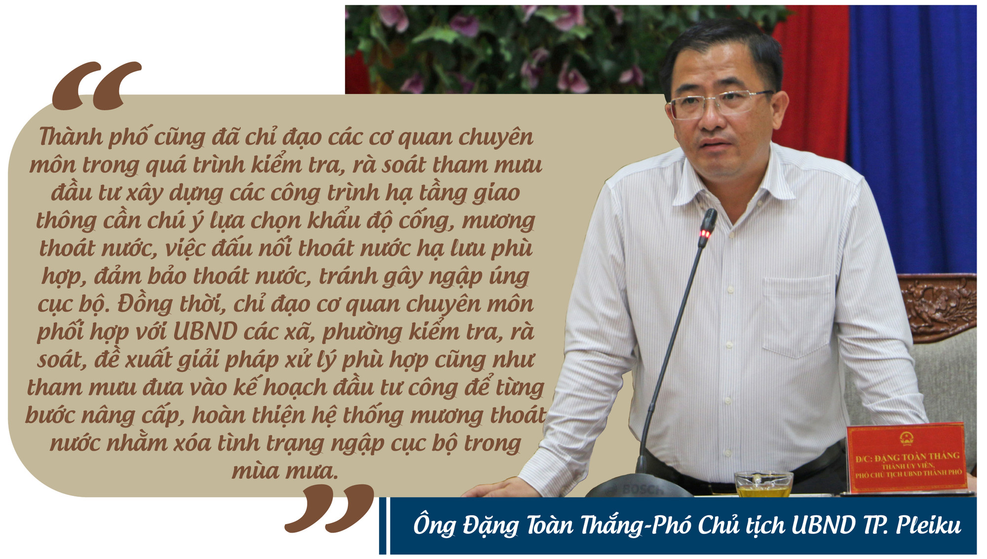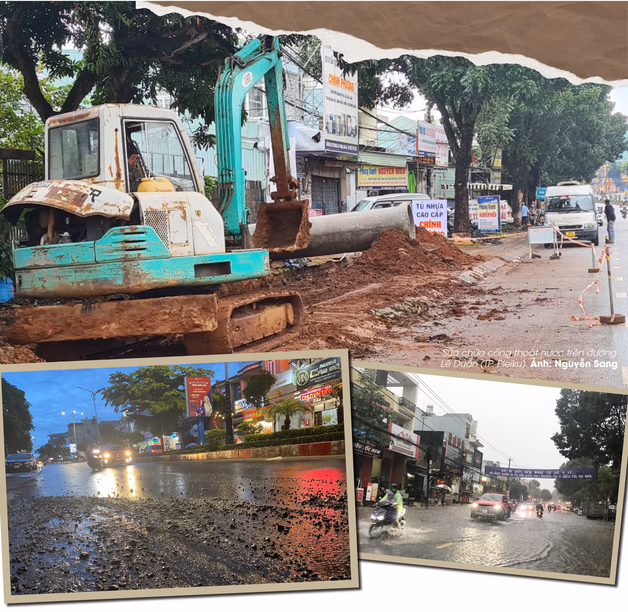 Theo Trưởng phòng Quản lý đô thị TP. Pleiku, do hệ thống thoát nước chưa được đầu tư hoàn chỉnh, đồng bộ dẫn đến khi mưa lớn, lượng nước tập trung nhiều về các điểm trũng thấp, gây quá tải hệ thống thoát nước dẫn đến ngập cục bộ. Cùng với đó, các cửa thu trên một số tuyến đường bị tắc nghẽn gây ngập cục bộ một số vị trí. Hệ thống cửa thu nước tại một số tuyến đường như: Phạm Văn Đồng, Lê Duẩn, Cách Mạng Tháng Tám... có kích thước nhỏ, không đáp ứng nhu cầu thoát nước, nhất là tại các vị trí trũng thấp.