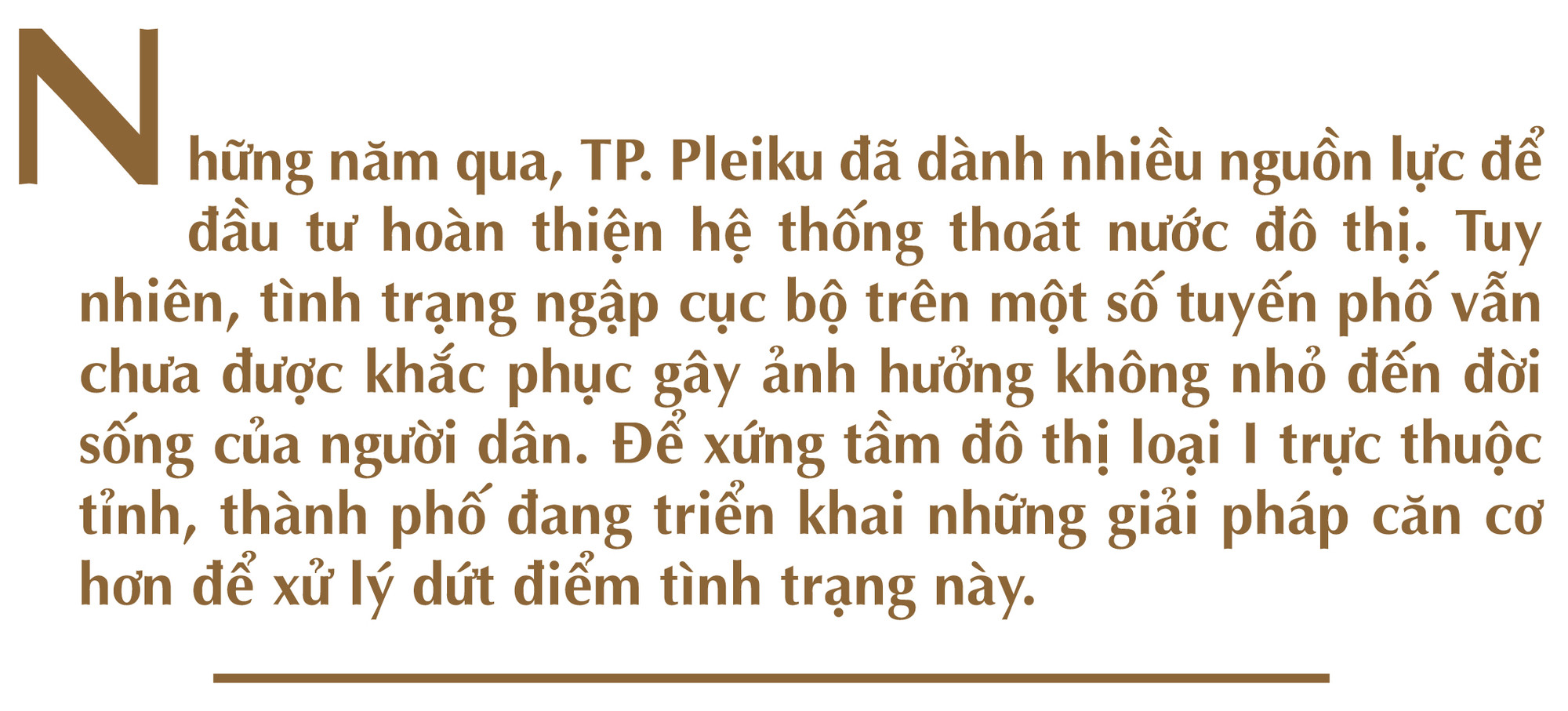 Trao đổi với P.V, ông Đặng Toàn Thắng-Phó Chủ tịch UBND TP. Pleiku-cho rằng: Với tốc độ đô thị hóa ngày càng cao thì việc quản lý quy hoạch xây dựng và quản lý đô thị là hết sức cần thiết. Trong đó, quy hoạch hạ tầng kỹ thuật nói chung, quy hoạch cốt nền và thoát nước mặt đô thị nói riêng cần được chú trọng từ giai đoạn lập quy hoạch đến giai đoạn triển khai xây dựng. Ủy ban nhân dân thành phố đã chỉ đạo các cơ quan, đơn vị nhanh chóng hoàn thiện các đồ án quy hoạch phân khu, quy hoạch chi tiết trên địa bàn thành phố để có cơ sở triển khai đồng bộ các dự án đầu tư xây dựng đảm bảo xử lý thoát nước cho từng khu vực và toàn thành phố. Đồng thời, chỉ đạo các chủ đầu tư khẩn trương triển khai thi công hoàn thành các công trình đầu tư xây dựng, xử lý thoát nước đã được thành phố giao kế hoạch thực hiện trong năm 2022. Các công trình sau khi hoàn thành sẽ góp phần xử lý tình trạng ngập úng cục bộ tại một số điểm dân cư.