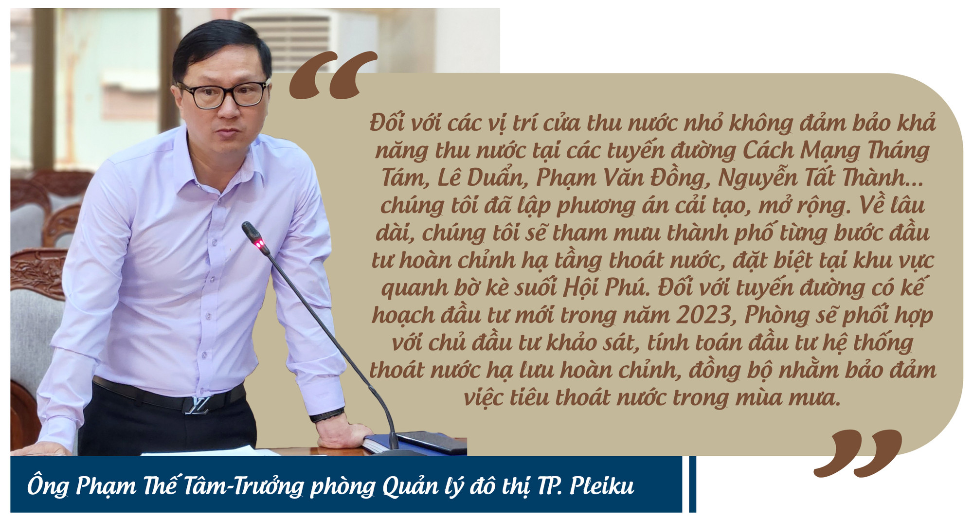 “Trước mắt, để chống ngập trong mùa mưa bão năm nay, Phòng Quản lý đô thị tiếp tục phối hợp với UBND các xã, phường đẩy mạnh tuyên truyền, vận động người dân không để rác tại các cửa thu nước tránh gây tắc nghẽn và làm giảm khả năng thu nước tại các tuyến đường. Đồng thời, phối hợp với Công ty cổ phần Công trình đô thị Gia Lai rà soát, kiểm tra, khơi thông cửa thu nước bị tắc nghẽn trên các tuyến đường nhằm đảm bảo thoát nước”-ông Tâm thông tin thêm.