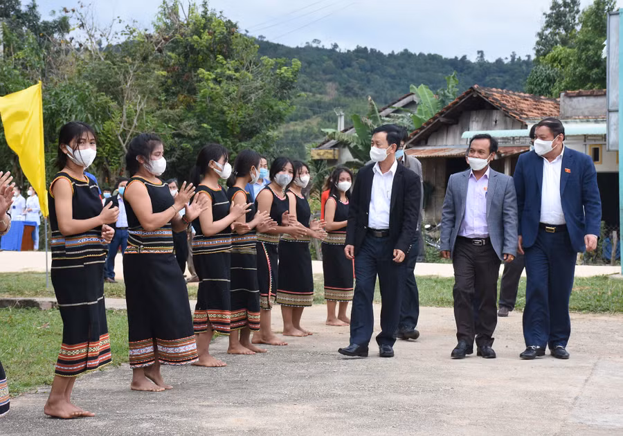 | Đồng chí Bí thư Tỉnh ủy Dương Văn Trang và Bộ trưởng Bộ VH-TT&DL Nguyễn Văn Hùng dự lễ tái hiện Tết “Et Đông” ở làng Kon Brắp Ju. Ảnh: VP |