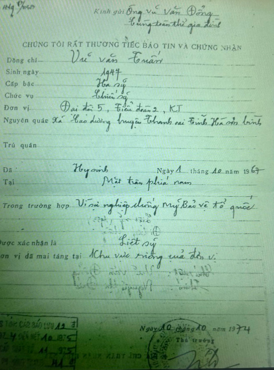 Địa danh: Làng Rộn Ràng, bên bờ sông A Yun, huyện Chư Sê, tỉnh Gia Lai. Phiên hiệu đơn vị: Đại đội 5, Tiểu đoàn 2 KT, Trung đoàn 95, gia đình xin gửi một vài tư liệu hiện còn (hình) và nhờ các bác, cô chú, ông bà ai biết được thông tin của Liệt sĩ Vũ Văn Tuấn cho gia đình xin để tìm kiếm và đưa hài cốt của Liệt sĩ về quê hương cùng mẹ già gần trăm tuổi (Mẹ Việt Nam Anh hùng) hiện còn sống và ngày đêm mong ngóng được đón con về trước khi nhắm mắt xuôi tay.