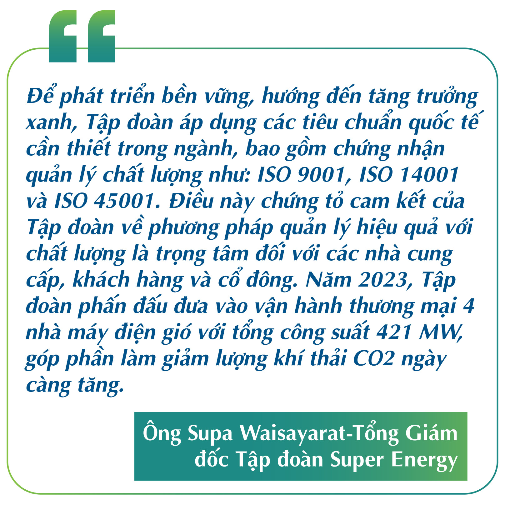 Tập đoàn Super Energy đang kết hợp các mục tiêu môi trường, xã hội và quản trị vào hoạt động sản xuất kinh doanh. Đến nay, Tập đoàn đã đưa vào vận hành thương mại 9 nhà máy điện mặt trời và 1 nhà máy điện gió HBRE Chư Prông với tổng công suất hơn 886 MW. Hàng năm, Tập đoàn cung cấp cho Tập đoàn Điện lực Việt Nam hơn 1,3 triệu kWh điện. Sản lượng điện sản xuất từ năng lượng tái tạo này đã góp phần giảm lượng khí thải carbon khoảng hơn 1,3 triệu tấn.