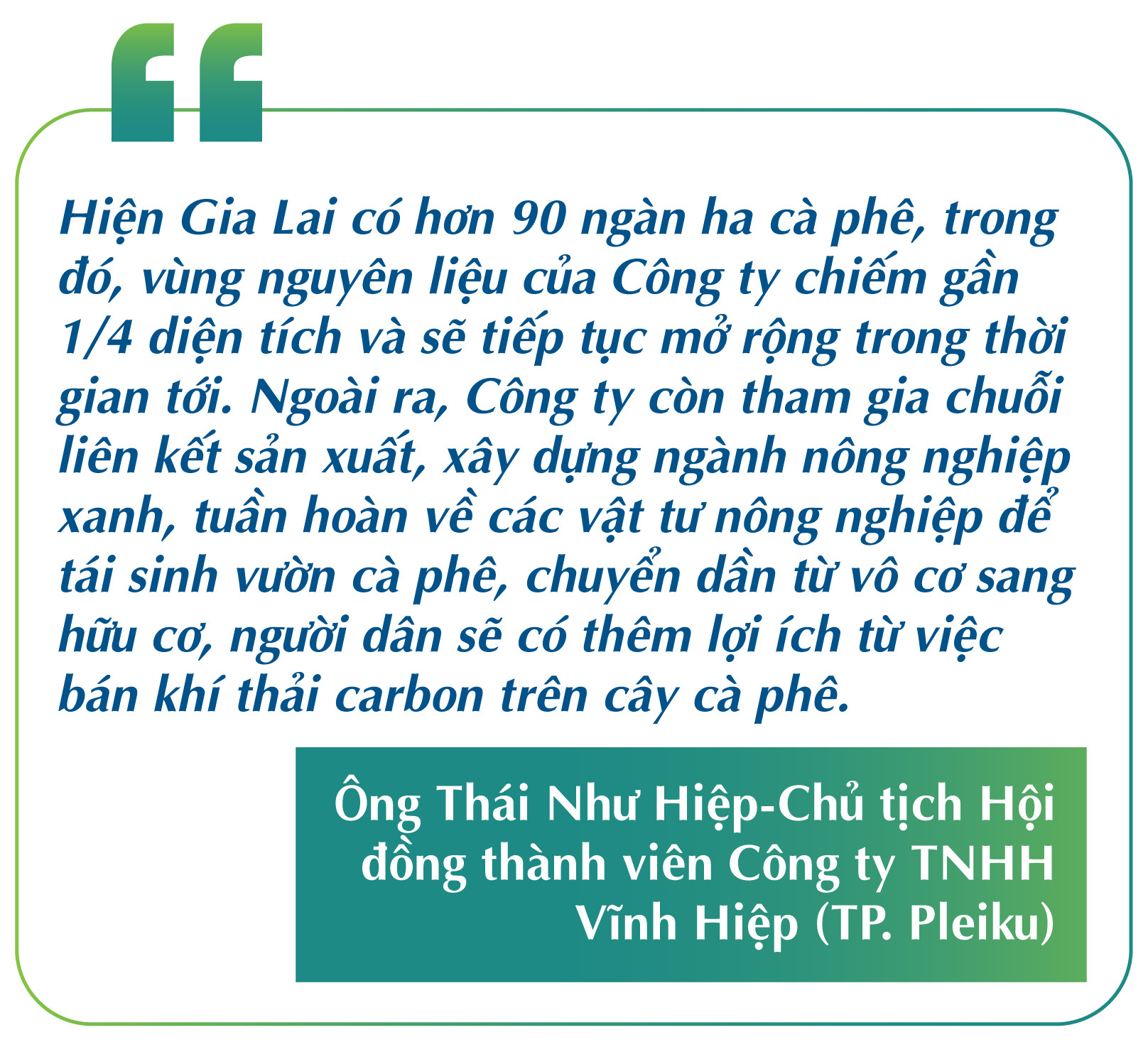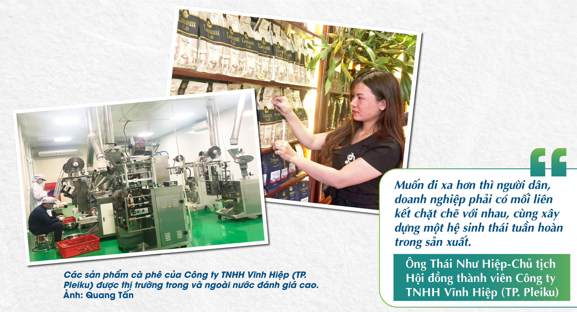 Những năm qua, Gia Lai đang từng bước định hình và xây dựng nền kinh tế theo hướng tuần hoàn, góp phần thúc đẩy tăng trưởng xanh, đảm bảo hài hòa giữa phát triển kinh tế-xã hội và bảo vệ môi trường. Công ty TNHH Vĩnh Hiệp (TP. Pleiku) là một trong những doanh nghiệp tiên phong xây dựng chuỗi liên kết sản xuất cà phê khép kín, từng bước xây dựng hệ sinh thái nông nghiệp tuần hoàn.