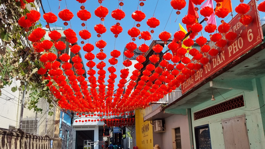 | Đi dọc con hẻm, không khó để bắt gặp những con hẻm rợp bóng đèn lồng, cờ tạo nên một bức tranh sắc màu và rực rỡ tạo nên một khung cảnh thú vị đáng nhớ trong dịp xuân về. |