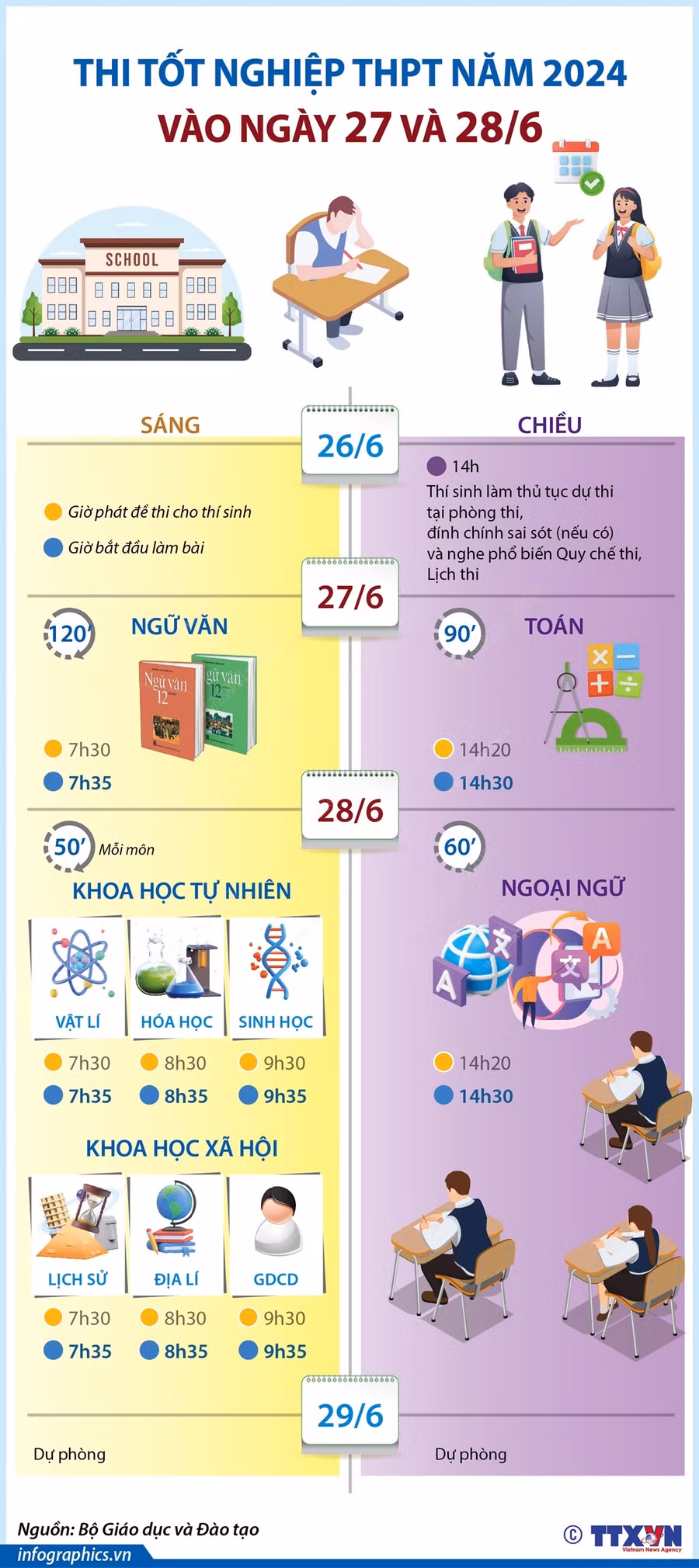 Cụ thể, ngày 26/6: làm thủ tục dự thi; ngày 27,28/6/2024: tổ chức coi thi; ngày 29/6/2024: dự phòng.