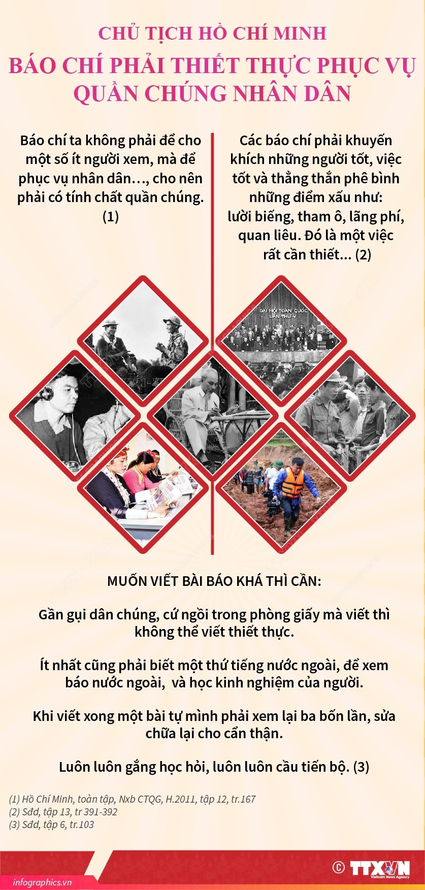 Một trong những nội dung quan trọng được Chủ tịch Hồ Chí Minh đề cập nhiều nhất là đạo đức cách mạng của người làm báo, việc xây dựng các thế hệ nhà báo cách mạng đủ đức, đủ tài, trở thành lực lượng xung kích trên mặt trận tư tưởng, văn hóa của Đảng. Cho đến nay, những lời dạy của Chủ tịch Hồ Chí Minh mãi là “kim chỉ nam” cho các thế hệ nhà báo, cơ quan báo chí trong quá trình tu dưỡng, phấn đấu, trưởng thành và lớn mạnh.