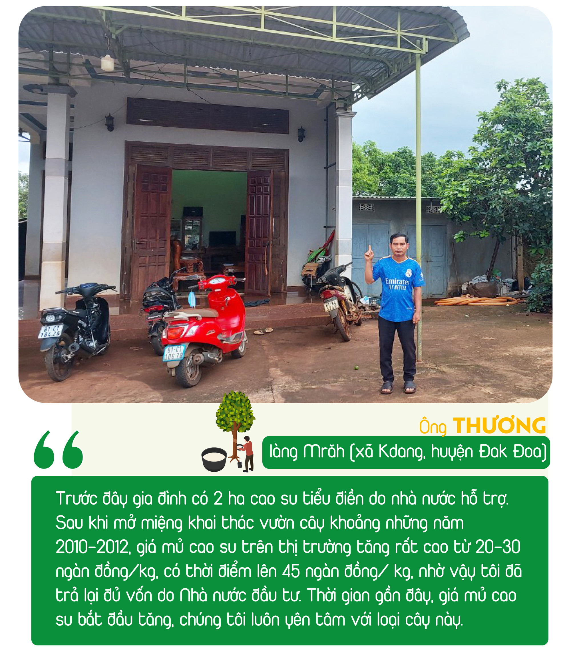 Nắm rõ những lợi thế mà cây cao su mang lại, tỉnh Gia Lai đã có nhiều chính sách, chủ trương cụ thể để phát triển loại cây này trong đó Quyết định số 871/QĐUBND, ngày 28-12-2009 của UBND tỉnh Gia Lai về việc phê duyệt Quy hoạch phát triển cao su trên địa bàn tỉnh Gia Lai đến năm 2015 và định hướng đến năm 2020. Cùng với đó, tỉnh cũng có các chính sách hỗ trợ người dân tộc thiểu số trồng cao su tiểu điền. Làng Mrăh (xã Kdang, huyện Đak Đoa) là một trong những ngôi làng được tỉnh lựa chọn triển khai thực hiện Dự án trồng cao su tiểu điền. Ông Thương (làng Mrăh, xã Kdang) là một trong những hộ gia đình được hưởng lợi từ dự án này.
