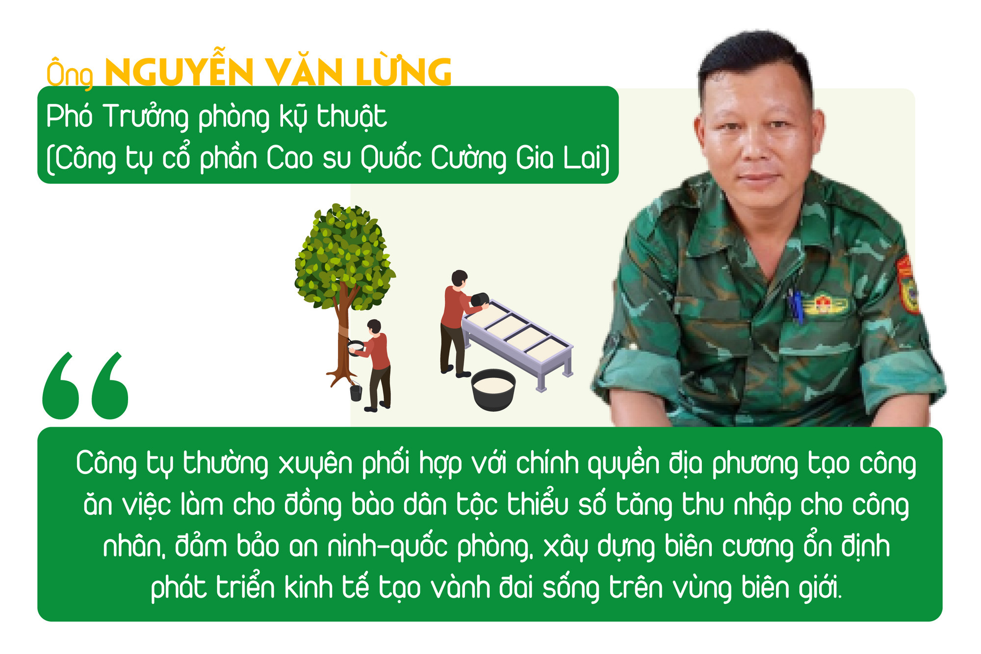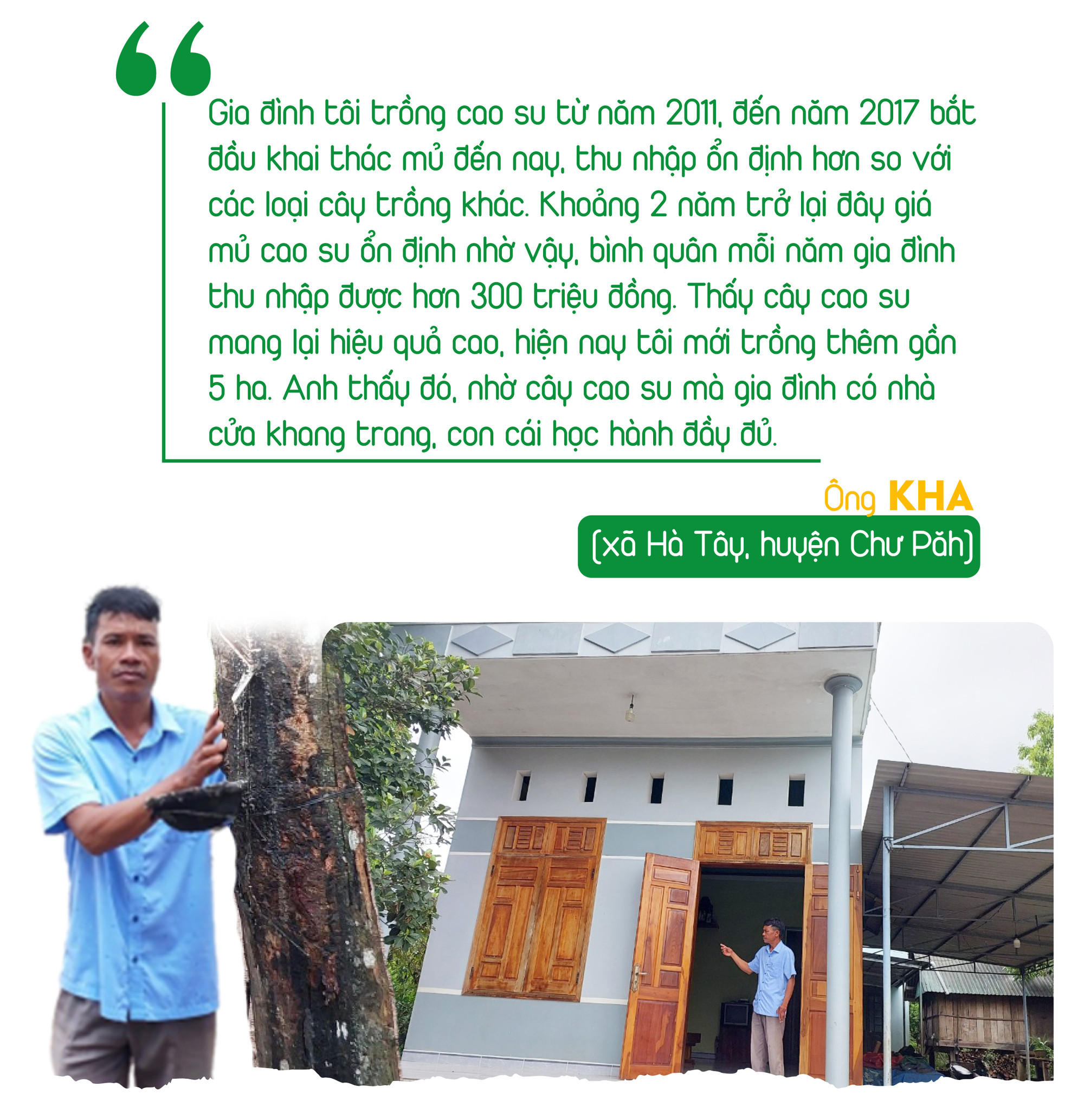 Đi trên tuyến biên giới dài hơn 80 km của tỉnh, hay xuôi về những vùng đất trồng cao su ở Mang Yang, Chư Păh, Đak Đoa… ở đâu có cây cao su là ở đó có những thôn, làng phát triển. Điều này cũng được minh chứng qua lời nói của ông Nguyễn Hữu Thọ-Bí thư Huyện ủy Đak Đoa: “Cây cao su thực sự đã đem lại cuộc sống ấm no, hạnh phúc cho người dân, đây là cây trồng không thể thay thế. Cùng với đó, các đơn vị, doanh nghiệp trồng cao su đã có nhiều đóng góp vào sự phát triển của cơ sở hạ tầng, xây dựng nông thôn mới, góp phần thực hiện thắng lợi nghị quyết mà đại hội Đảng bộ các cấp đã đề ra".