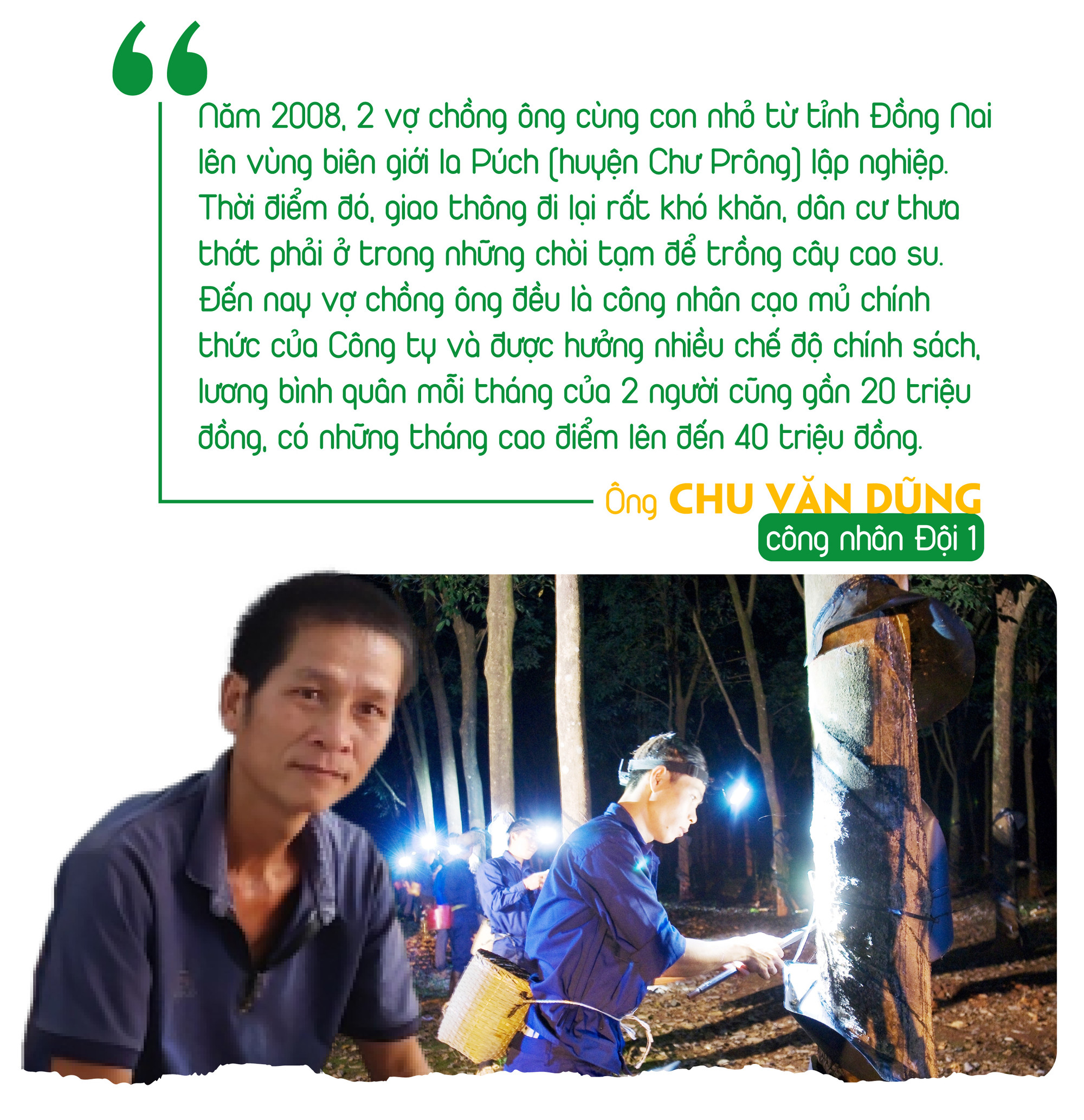 Cách nhà ông Dũng không xa là nhà của anh Trần Văn Ngành-công nhân cạo mủ Đội 2. Anh gắn bó với Công ty Cổ phần Cao su Quốc Cường Gia Lai hơn 10 năm. Anh chia sẻ: Năm 2013, tôi rời quê Sóc Trăng lên vùng đất Ia Púch sinh sống và làm công nhân. So với trước, cuộc sống bây giờ đã thoải mái hơn nhiều, các dịch vụ ăn uống, cửa hàng tạp hóa ở cụm dân cư của Công ty đã đầy đủ, lương 2 vợ chồng mỗi tháng cũng gần 20 triệu đồng. Nếu chịu khó làm thì sẽ tích lũy được vốn cho con sau này. “Lúc đầu chúng tôi không biết cạo mủ, nhưng giờ cạo mủ thành thạo và cạo làm sao để có nhiều mủ nhưng không ảnh hưởng đến chất lượng vườn cây”-anh Ngành khẳng định.