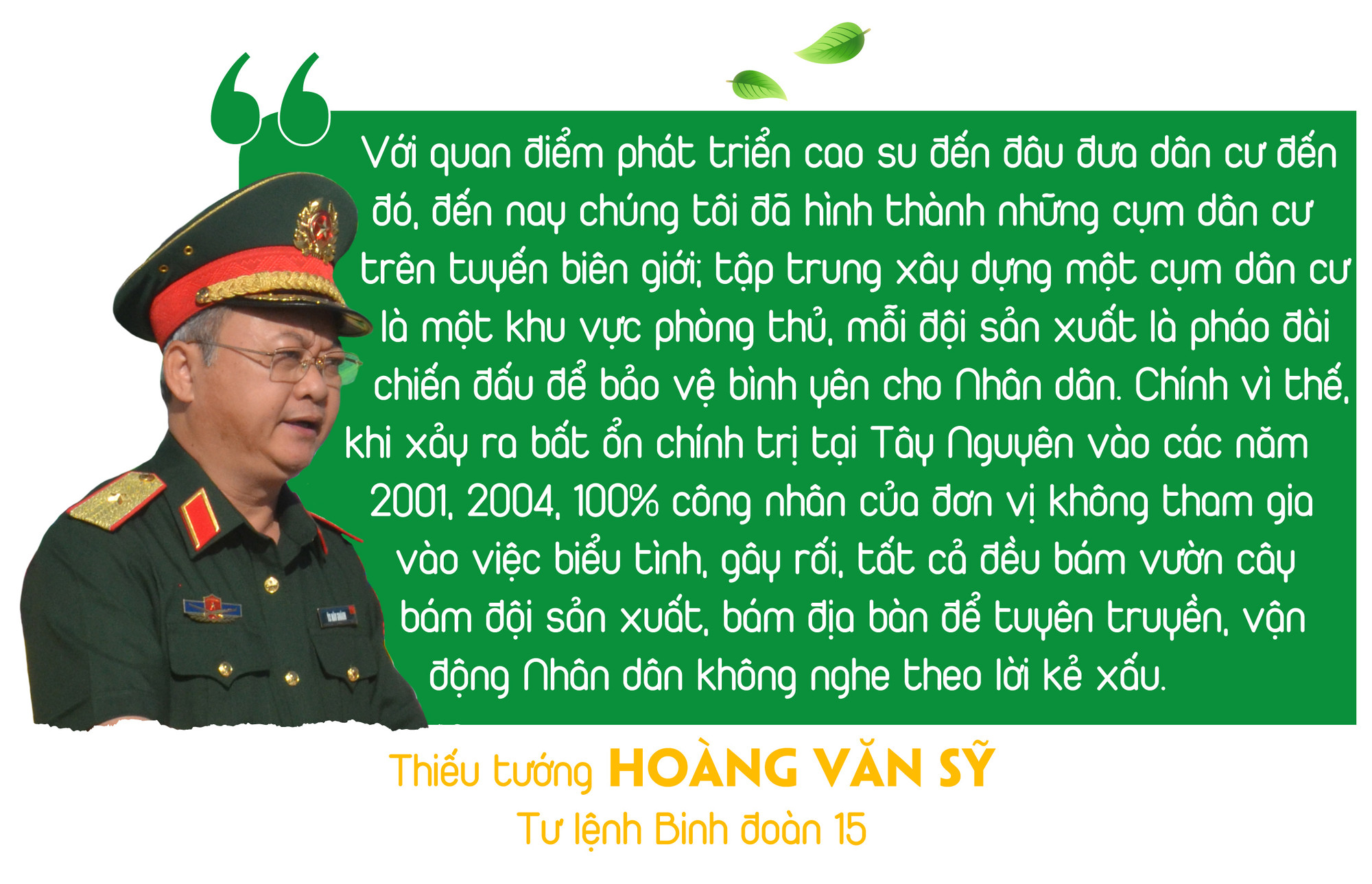 Nếu ai có dịp lên biên giới Ia Grai, Đức Cơ, Chư Prông, bên cạnh những rừng cao su xanh ngát thì những cụm dân cư, cơ sở hạ tầng được xây dựng đã góp phần làm cho bộ mặt nông thôn trên vùng biên viễn thêm phần khởi sắc. Binh đoàn 15 là đơn vị thực hiện nhiệm vụ quốc phòng kết hợp với kinh tế, xây dựng dân cư, xã hội trên địa bàn chiến lược Tây Nguyên. Hiện nay, Binh đoàn 15 thực hiện nhiệm vụ trên 271 thôn, làng thuộc 41 xã, 9 huyện, thành phố của 4 tỉnh (Gia Lai, Kon Tum, Quảng Bình, Bình Định) địa bàn chủ yếu ở vùng sâu, vùng xa, biên giới, vùng dân tộc thiểu số. Binh đoàn thường xuyên tạo việc làm với thu nhập ổn định cho hơn 16.000 lao động, trong đó 60% lao động là người dân tộc thiểu số.