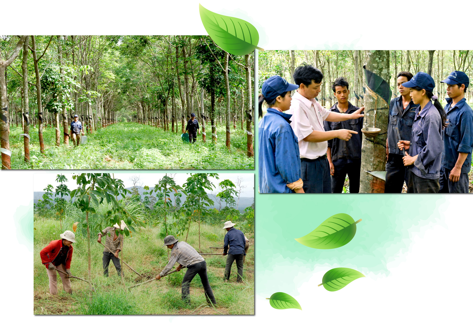 Ông Lừng cho biết: Công ty đang quản lý 1.376 ha, trong đó diện tích đưa vào khai thác mủ 1.231 ha, còn lại cao su đang trong giai đoạn chăm sóc, kiến thiết cơ bản. Hiện tại đơn vị đảm bảo việc làm ổn định cho 250 công nhân; vào mùa cao điểm cạo mủ có trên 300 lao động. Đơn vị có 3 đội sản xuất gồm: Đội 1, 2 và 3 nằm dọc Quốc lộ 14C. Hiện nay, công nhân của đơn vị gồm 9 dân tộc cùng sinh sống và làm việc. Công ty đã xây dựng 157 căn nhà cho công nhân với diện tích mỗi căn khoảng 40m2 gồm: phòng khách, phòng ngủ, đảm bảo cho gia đình có 3-4 người sinh sống; kéo điện thắp sáng, khoan giếng cấp nước sinh hoạt miễn phí. Ngoài ra, có nhà giữ trẻ, trạm y tế chăm sóc sức khỏe cho công nhân.