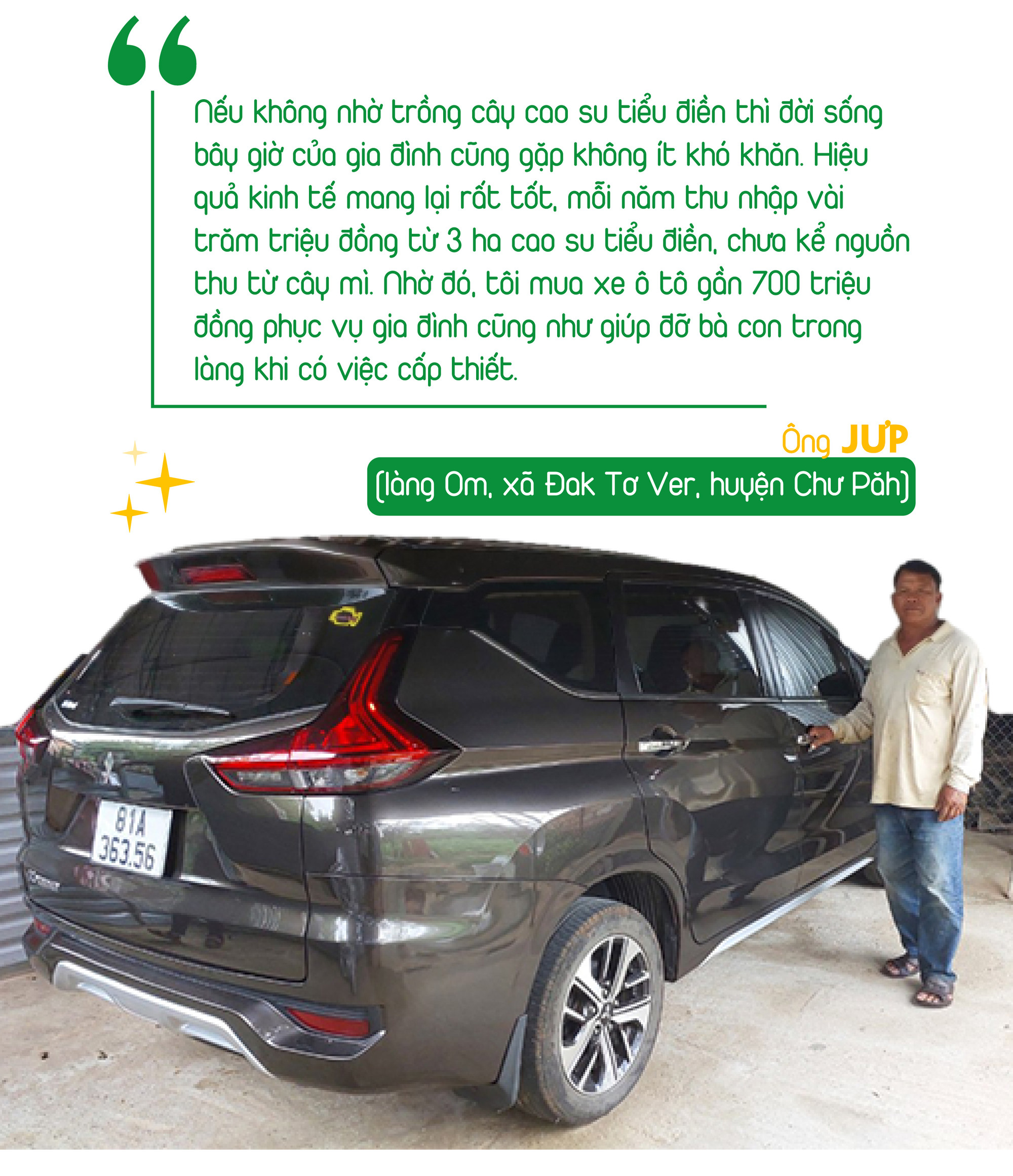 Chúng tôi ghé anh ông Jưp (làng Om, xã Đak Tơ Ver, huyện Chư Păh) chia sẻ: Tôi trồng cao su lâu rồi, lúc còn trẻ theo cha mẹ, cạo mủ cho Công ty Cao Su Chư Păh. Nhưng nếu chỉ cạo mủ thuê thôi thì đủ ăn, nhưng làm giàu thì lâu lắm, khi ra ở riêng được bố mẹ cho ít đất, thấy người dân ở các xã khác trong huyện trồng cao su tiểu điền thì tôi cũng trồng theo. Quá trình trồng cây cao su, tôi thấy không tốn công và dễ chăm sóc hơn so với trồng cây cà phê, tiêu, chanh dây nên rất yên tâm. Gia đình tôi có 6 ha cao su tiểu điền, trong đó thu 3 ha đang trong giai đoạn khai thác mủ. Hầu như ngày nào cũng có 4 công trong gia đình thường xuyên cạo mủ, cuối tuần thương lái đến nhà thu mua, mỗi tuần bán mủ đông được 13-15 triệu đồng/tuần (tùy theo giá mủ đông), trừ chi phí nhân công khoảng 5-6 triệu đồng/tuần, mỗi tháng thu nhập bình quân của gia đình khoảng 21 triệu đồng từ cây cao su.