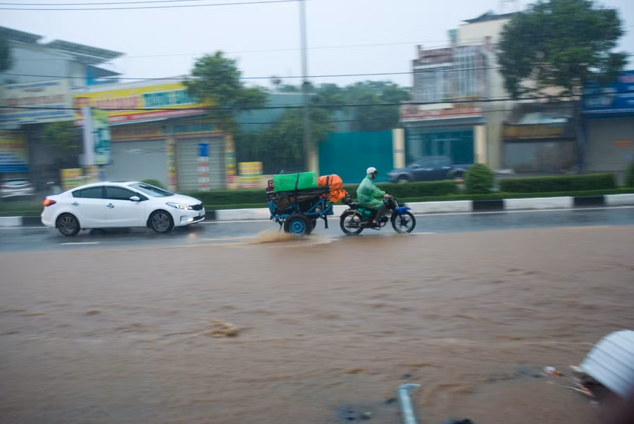 | Nước ngập hết nửa mặt đường khiến xe máy phải chen chúc sang làn đường ô tô để di chuyển. Ảnh: Huy Tịnh |