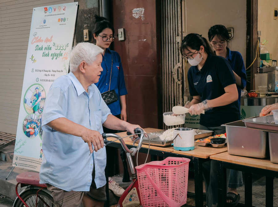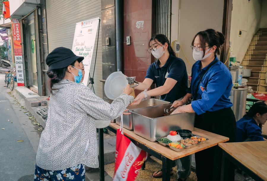 Càng về chiều dòng người xếp hàng đến nhà ăn 0 đồng Bạch Mai càng đông. Chị Thúy phải cố gắng ổn định hàng dài người xếp hàng phía sau để đảm bảo trật tự cho khu phố. Đôi tay các bạn tình nguyện viên thoăn thoắt xới cơm, canh, lấy dụng cụ đồ ăn trao cho những bệnh nhân đến nhận. Giọt mồ hôi lăn dài trên má, ướt bết mái tóc thực sự khiến bao người cảm động.