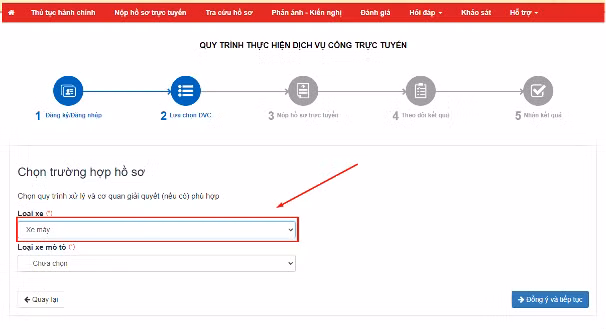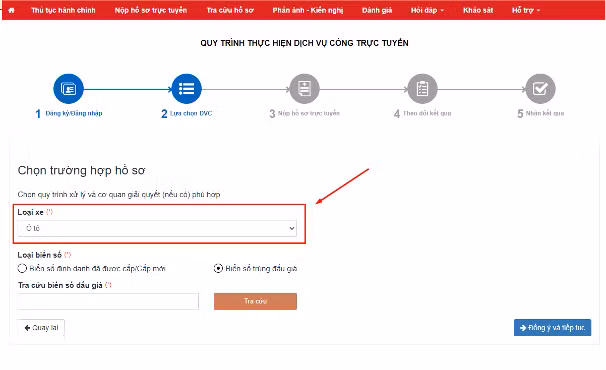 Công dân thực hiện lựa chọn loại xe muốn thực hiện kê khai dịch vụ công trực tuyến toàn trình.