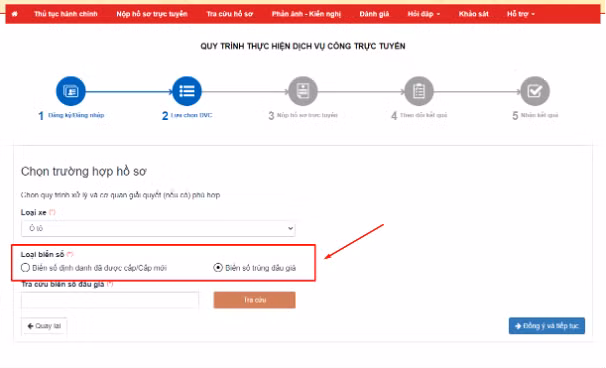 Tra cứu biển số trúng đấu giá: Đối với trường hợp đăng ký cấp biển số mới là biển số trúng đấu giá, công dân thực hiện nhập biển số trúng đấu giá và tra cứu.