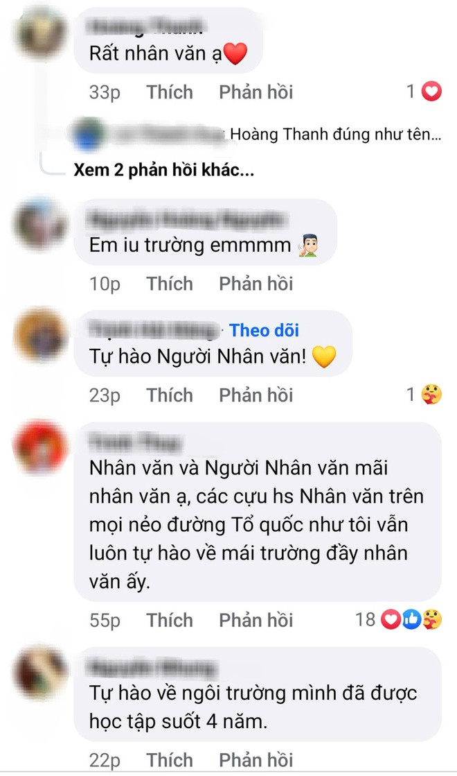 Tài khoản Quỳnh Như bình luận: "Em cảm thấy vui vì mình đã chọn đúng trường để học, tự hào khi mình là một "người dưới mái trường nhân văn". Vì bão lũ mà đã có biết bao nhiêu mất mát, đây thực sự là nỗi đau lớn với đồng bào ta. Cảm ơn trường vì đã có những đóng góp to lớn để giúp đỡ đồng bào dân tộc".