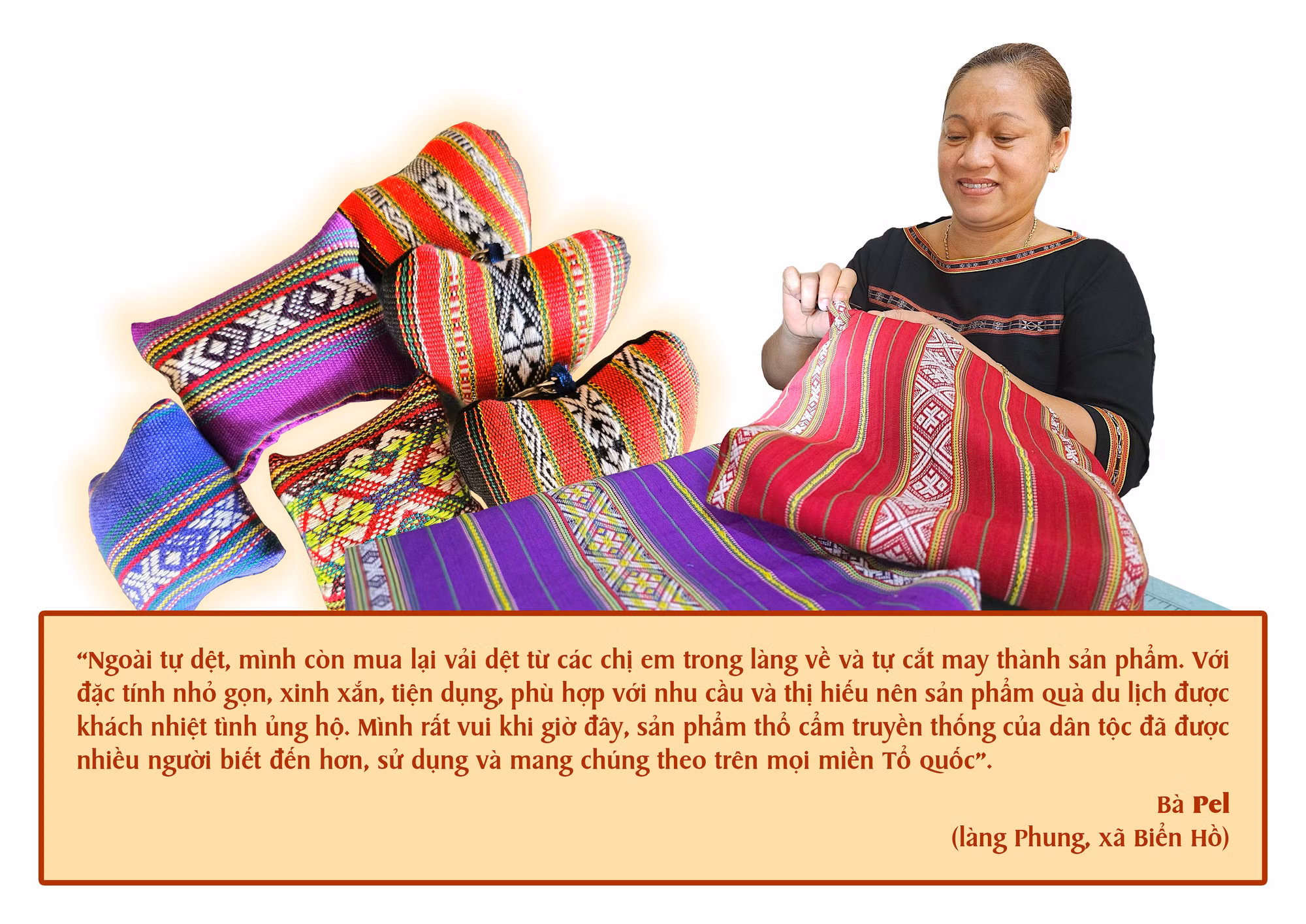 Bà Pel (làng Phung, xã Biển Hồ) là một trong số đó. Gần 40 năm qua, kể từ khi biết dệt thổ cẩm, chưa bao giờ nữ nghệ nhân này rời xa khung cửi cùng những sợi chỉ màu. Bởi lẽ với bà, đó không chỉ là mạch sống của bản thân mà còn là hồn cốt của dân tộc. Với sự khéo léo, sáng tạo cùng đức tính chăm chỉ, năm 20 tuổi, bà Pel đã là một trong những người dệt thổ cẩm đẹp nhất làng. Đến nay, bà thành thạo gần như tất thảy 89 mẫu hoa văn thổ cẩm Jrai, trong đó có nhiều mẫu rất khó dệt.