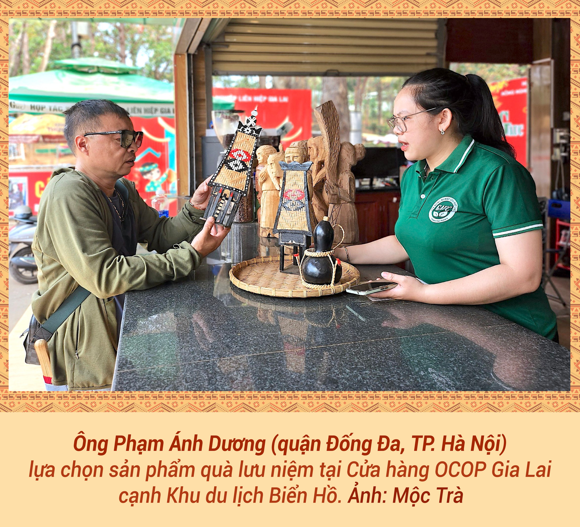 Từng đặt chân đến nhiều vùng miền trên cả nước, song ông Phạm Ánh Dương (quận Đống Đa, Hà Nội) vẫn dành tình cảm đặc biệt cho mảnh đất Gia Lai với khí hậu ôn hòa, giàu bản sắc văn hóa. Vì vậy, tháng 4 này, ông cùng một số đồng nghiệp quyết định trở lại Pleiku để tham quan, du lịch. Ngắm những món quà lưu niệm được bày bán tại Cửa hàng OCOP Gia Lai trước Khu du lịch Biển Hồ, ông Dương cho biết: “Là người yêu văn hóa dân gian nên tôi đặc biệt ấn tượng với sản phẩm quà tặng do đồng bào dân tộc thiểu số (DTTS) làm nên. Những mô hình nhà rông, tượng gỗ… tuy không tinh xảo như đồ thủ công mỹ nghệ nhưng lại chứa đựng sự mộc mạc, chân chất như chính người làm ra nó. Ngoài mua về trưng bày tại nhà, tôi còn tặng cho bạn bè và họ đều rất thích”.