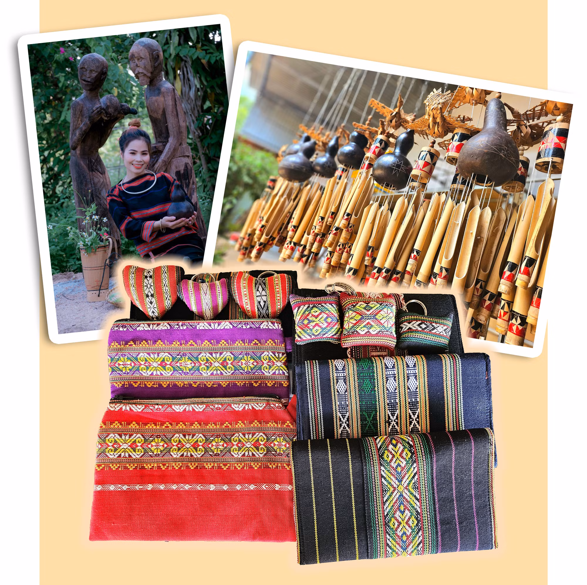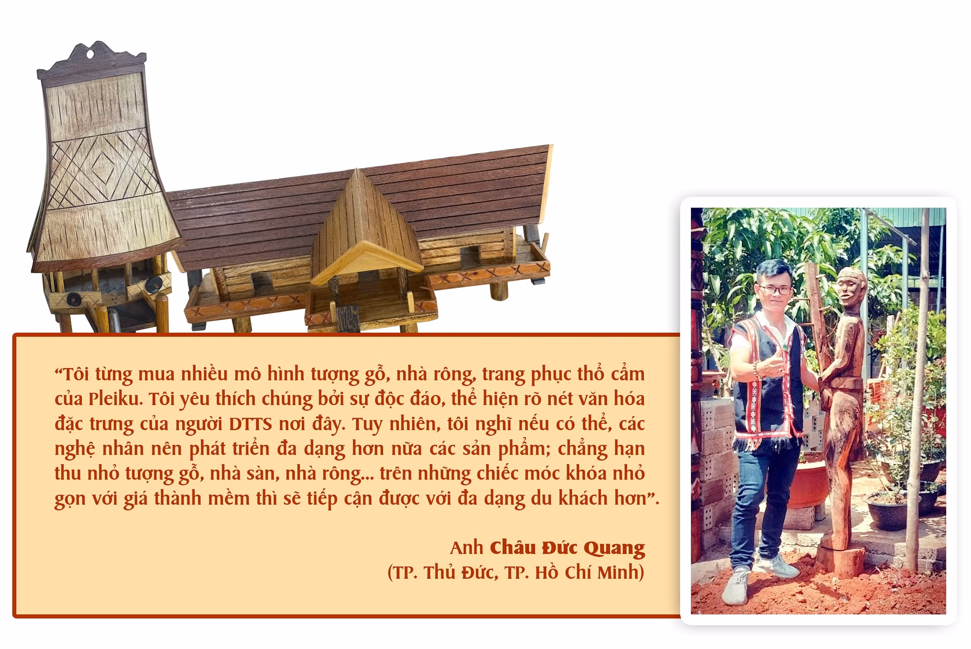 Hiện nay, các nghệ nhân ở TP. Pleiku cùng với chị Hương tạo ra khá nhiều thành phẩm, từ tượng gỗ, nhạc cụ dân tộc (chuông gió, đàn t’rưng, klông pút), nông cụ (cối gỗ, gùi) thu nhỏ đến trang phục, túi xách, ví, móc khóa… bằng thổ cẩm. Ngoài kết nối tiêu thụ sản phẩm tại các gian hàng trưng bày OCOP địa phương, cửa hàng lưu niệm, chị còn chủ động đặt vấn đề với một số đơn vị lữ hành đưa du khách đến tham quan, trải nghiệm và mua hàng tại chính các câu lạc bộ, hợp tác xã nghề truyền thống trên địa bàn thành phố.