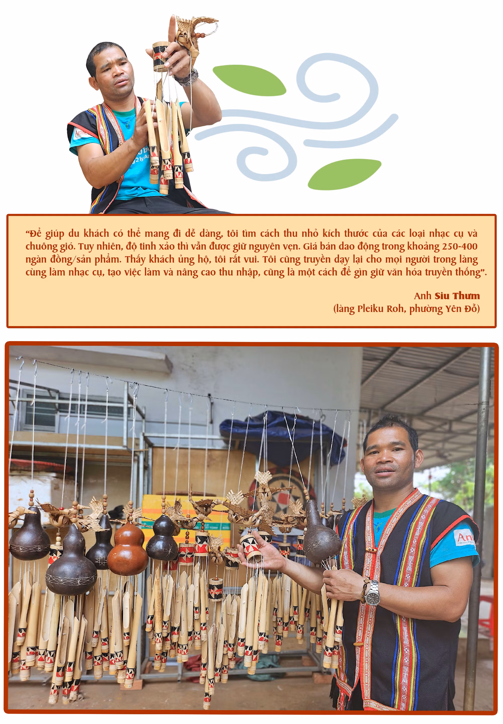 Cũng chung niềm đau đáu với văn hóa truyền thống, khi 15 tuổi, chàng trai Siu Thưm (làng Pleiku Roh, phường Yên Đỗ) đã lặn lội đi “tầm sư” học nghề chế tác nhạc cụ dân tộc. Niềm đam mê cộng với sự sáng dạ đã giúp Thưm nhanh chóng thạo nghề. Đến nay, đôi tay tài hoa của anh đã “thổi hồn” cho hàng trăm cây tre, thân nứa hay quả bầu khô vô tri thành những chiếc đàn t’rưng, k’ni, goong và chuông gió có thanh âm độc đáo.