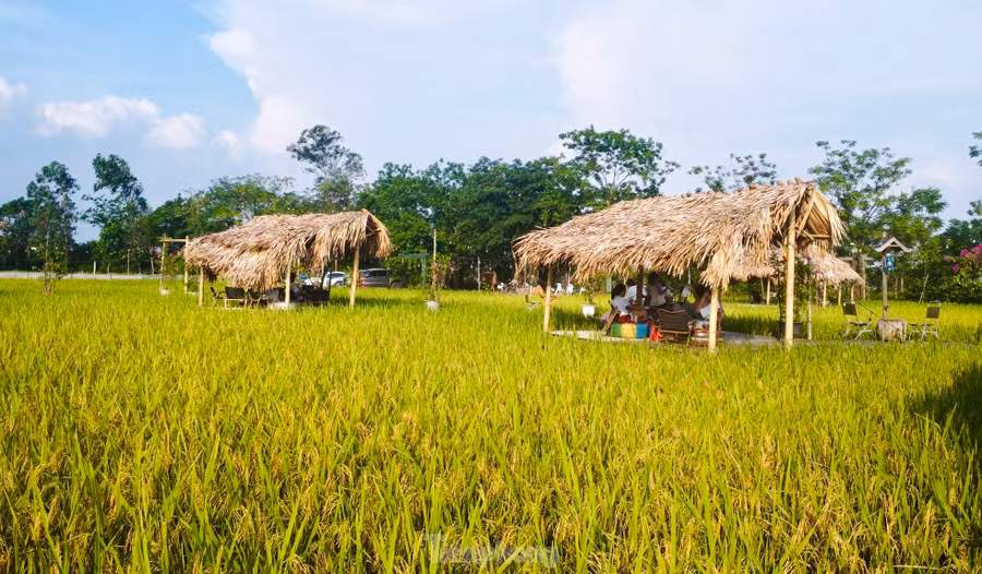 | Trên ruộng lúa rộng khoảng gần 2.000m2 giữa cánh đồng của làng, quán cà phê chỉ đơn giản với 5 chiếc chòi lợp lá cọ, không điều hòa, không máy lạnh, hòa mình hoàn toàn với thiên nhiên đã thực sự khiến các gia đình vô cùng thích thú. |