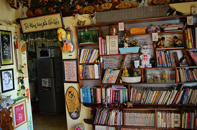 Quán có 3 gian khác nhau nhưng đều chung một kiểu trang trí tạo sự đồng nhất. Điểm nhấn phải kể đến là chiếc tủ sách ở gian đầu tiên với hàng trăm cuốn. Khách có thể thoải mái lựa chọn cho mình một quyển ưa thích, ngồi nhâm nhi tách cà phê nguyên chất được xay tại chỗ và thả hồn cùng những trang sách đó.